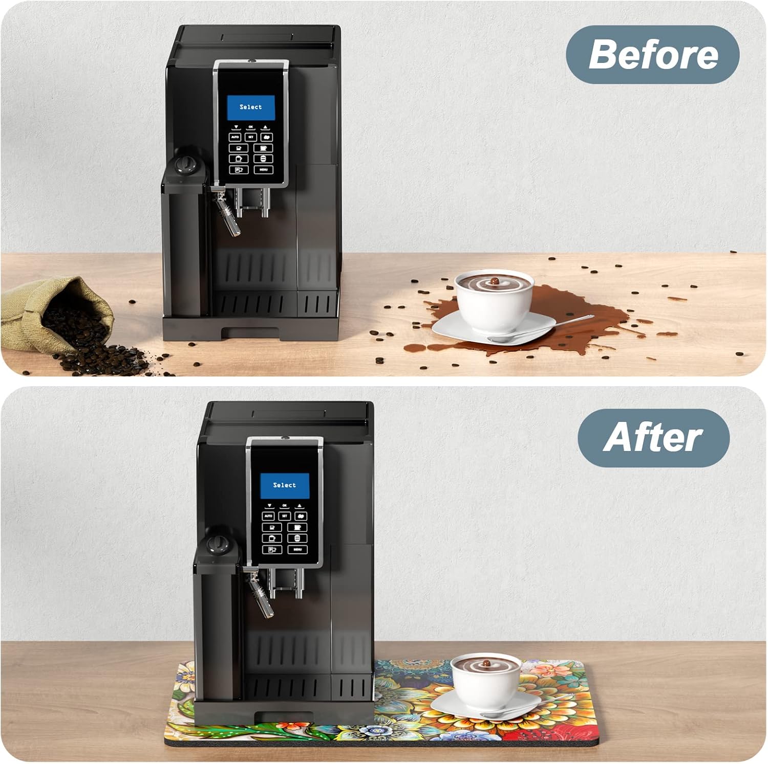 - Easy to Clean: The coffee bar mats for countertop can be cleaned with hand or machine to remove stains, up to 91% porosity material allows coffee bar mats to dry quickly without a machine