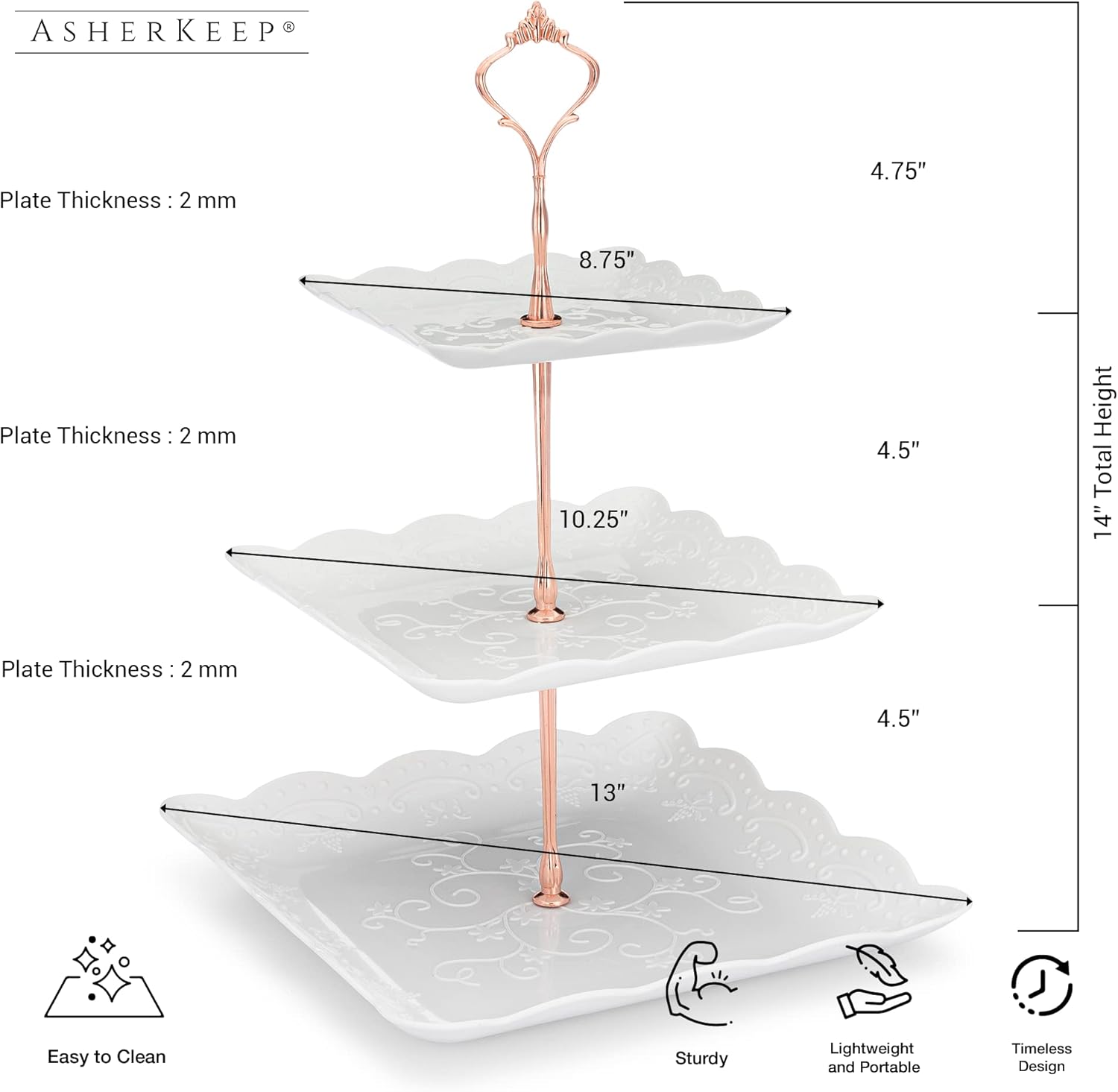 - EXQUISITE DESIGN: Display your cupcakes and sweet treats with our elegant and timeless style of three-tier cupcake stand. Made with thick white plates and rose gold colored struts, our cupcake stand makes the perfect addition to any table setting. They coordinate with any occasion's decor and maintain a sophisticated look with their intricate lines. Make your dessert tower stand out with our exquisite cupcake holder that you can use for any occasion.