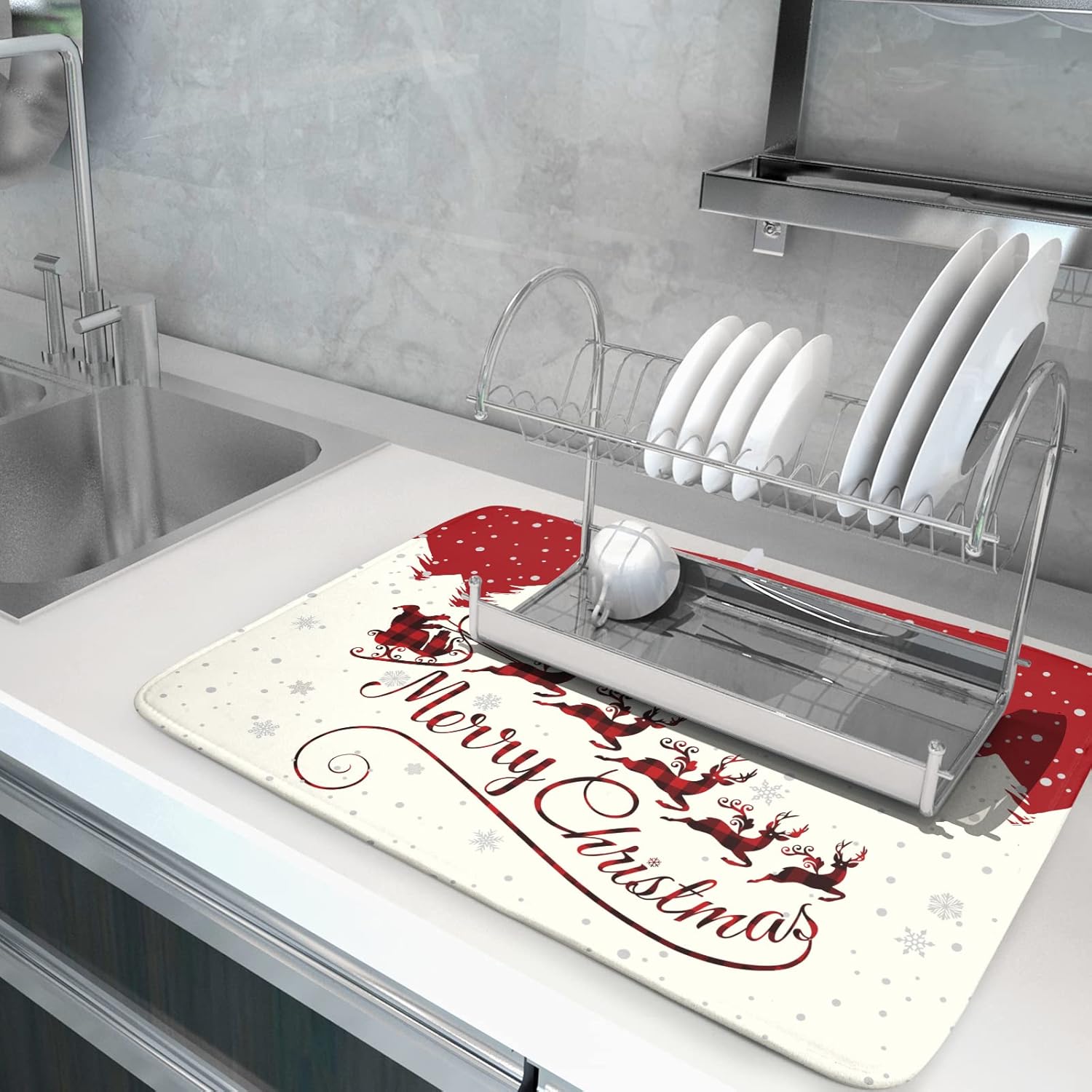 - Dish drying mat size: 18x24 inches, high quality polyester Christmas Reindeer dish drying mat. Made of microfiber,super absorbent and fast drying dish drying mat. Absorbent microfiber, in a 3-layer design without sacrificing its softness. Both sides can be used, one with a beautiful Snowflake and Santa Claus pattern, the other with a gray non-slip bottom. Santa drying Mat for Coffee Bar Countertops fits most countertops while providing a smart, sharp look.