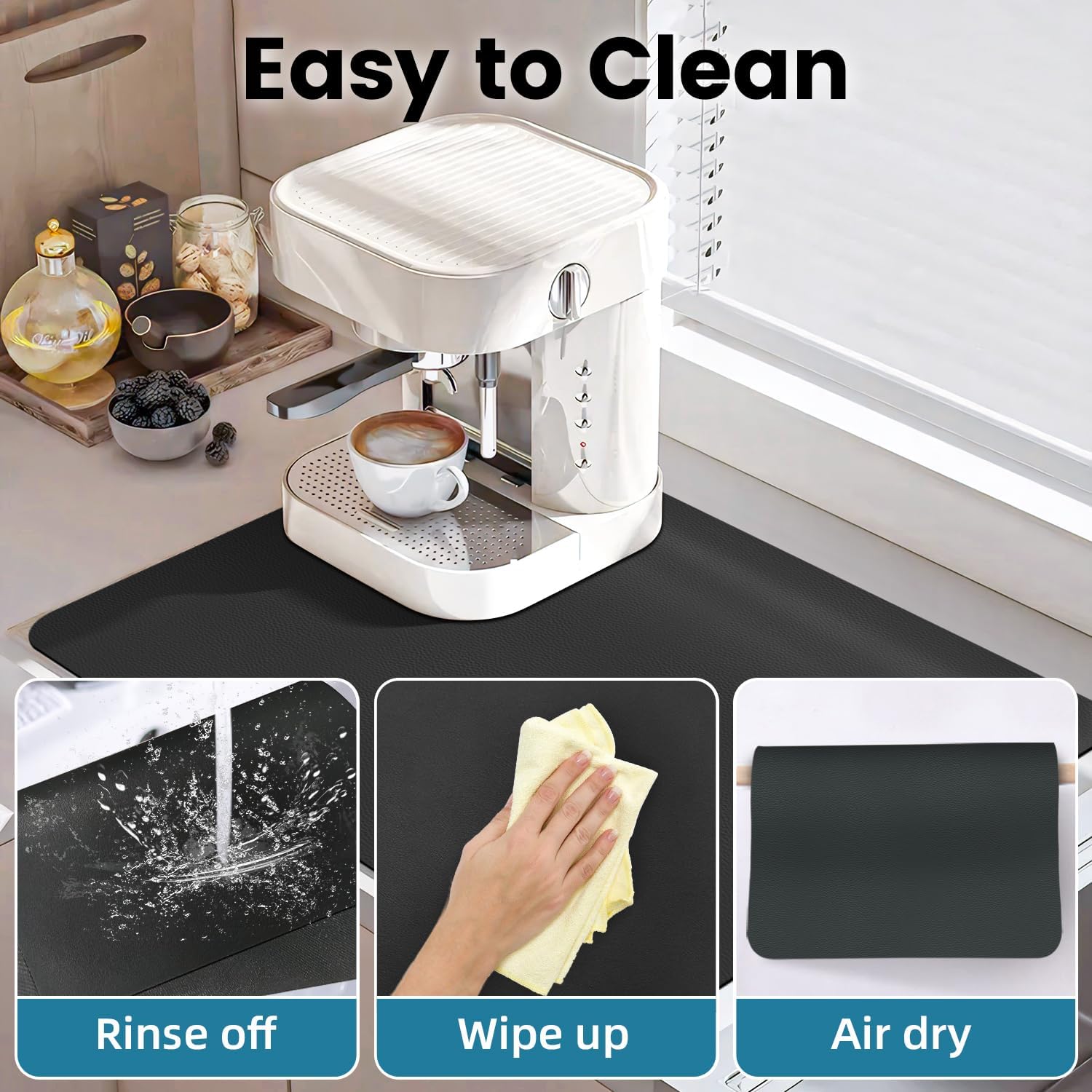 - Super Absorbent and Quick Dry: The coffee bar mats for countertop with absorbent diatomite in middle layer, which quickly absorb liquids and catch splashes. Without worrying about soiling your countertop while making coffee by using under coffee maker mat
