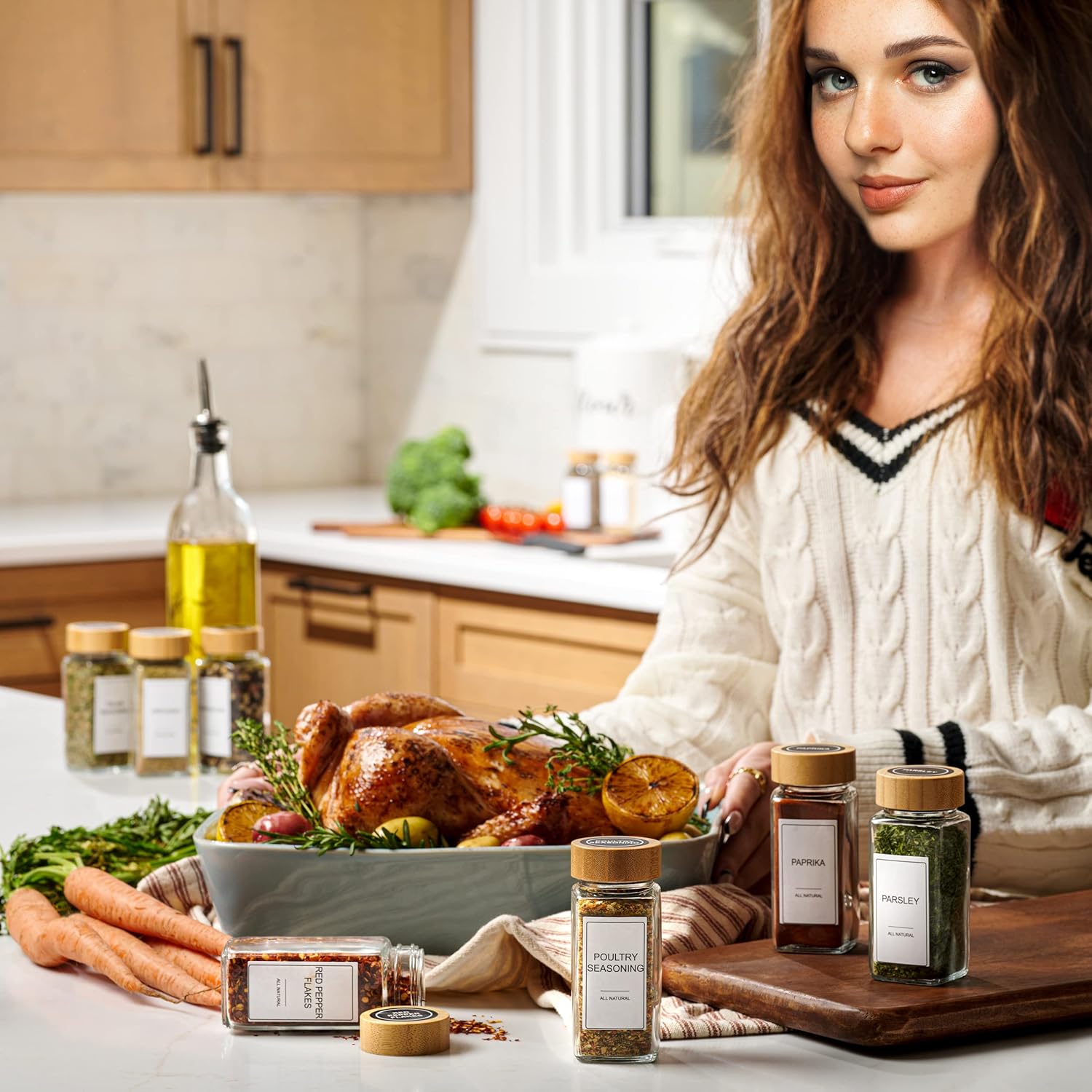 Set of 24 Glass Spice Jars with Various Labels, Bamboo Shaker Lids & Funnel, Kitchen Storage Jars with Airtight Lid, Spices & Seasonings Sets Organizer, Spice Containers, Glass Jar Food Canister