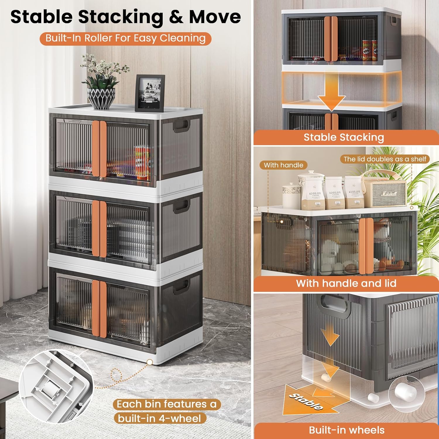 19Gal Collapsible Storage Bins with Lids & Wheels - 4 Pack Stackable with Doors, Heavy-Duty Plastic Containers for Home/Office, White