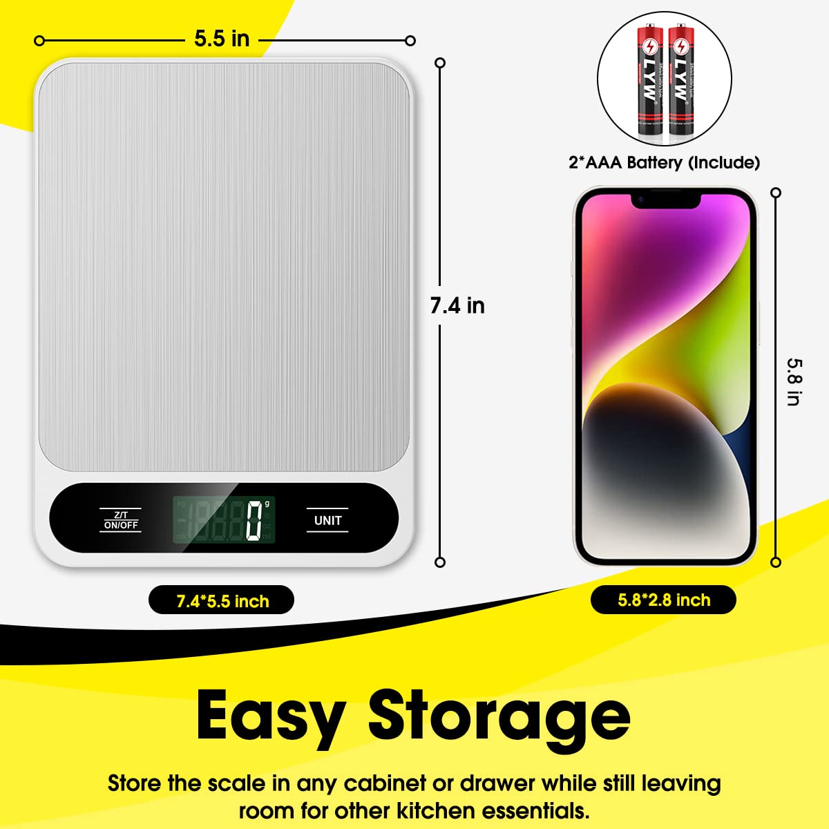- 【Compact Sleek】The kitchen scale is designed with food-grade 304 stainless-steel platform for easy cleaning and maintenance. The food scale’s convenient size design make it easy to store in your kitchen.