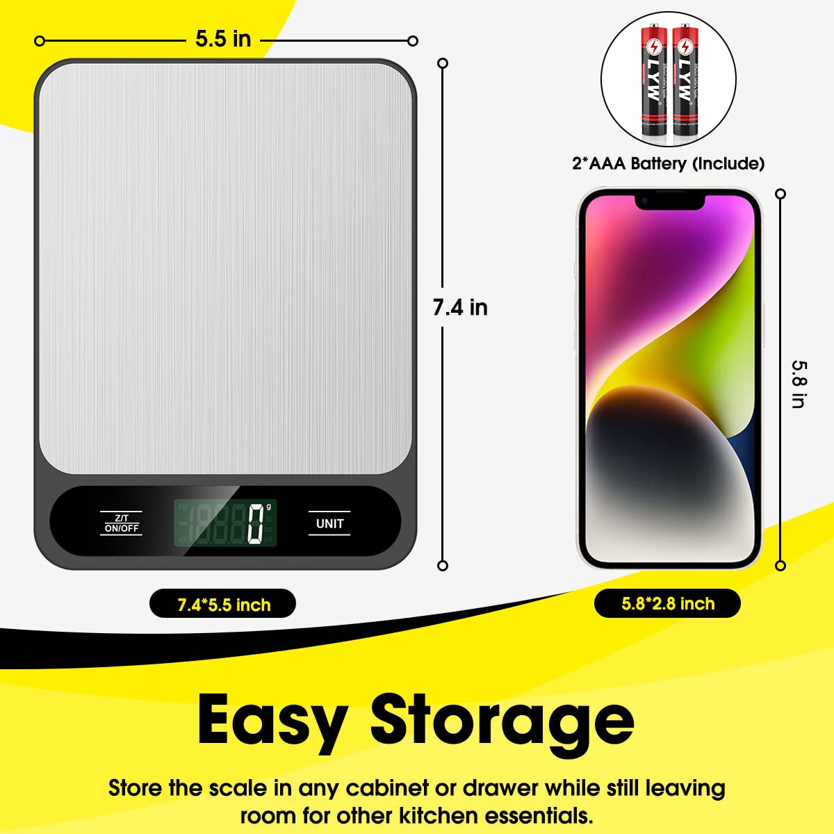 - 【Portable Design】- Small Scale Dimensions:7.4 x 5.5 x 0.6 inches. The digital kitchen scale’s convenient size makes it easy to store in your kitchen.