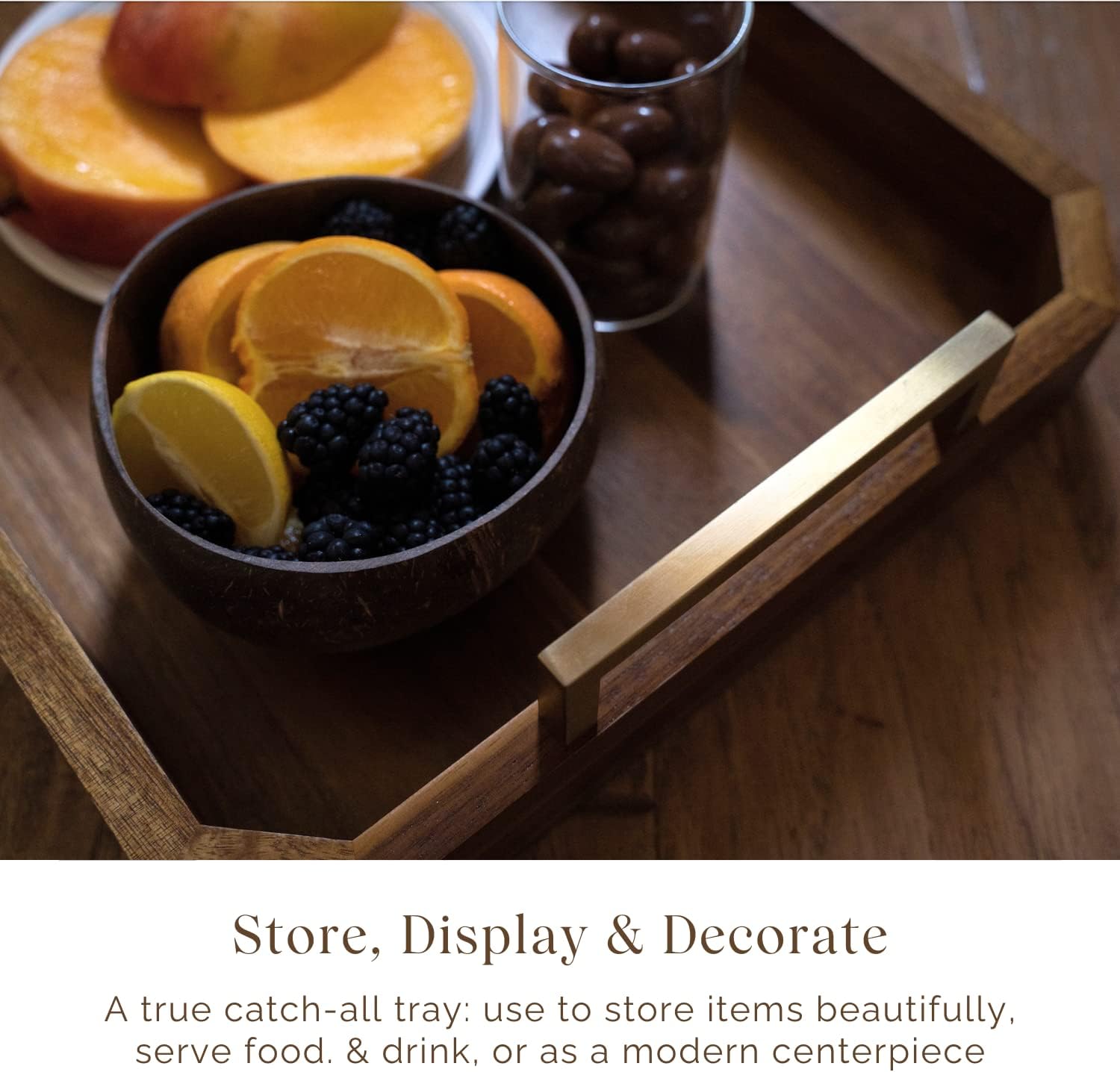 Decorative Acacia Wood Ottoman Tray - Coffee Table Tray - Breakfast, Party, Drinks, Snack, Liquor Serving Platter - Farmhouse to Modern - Brass Handles (Varnish)