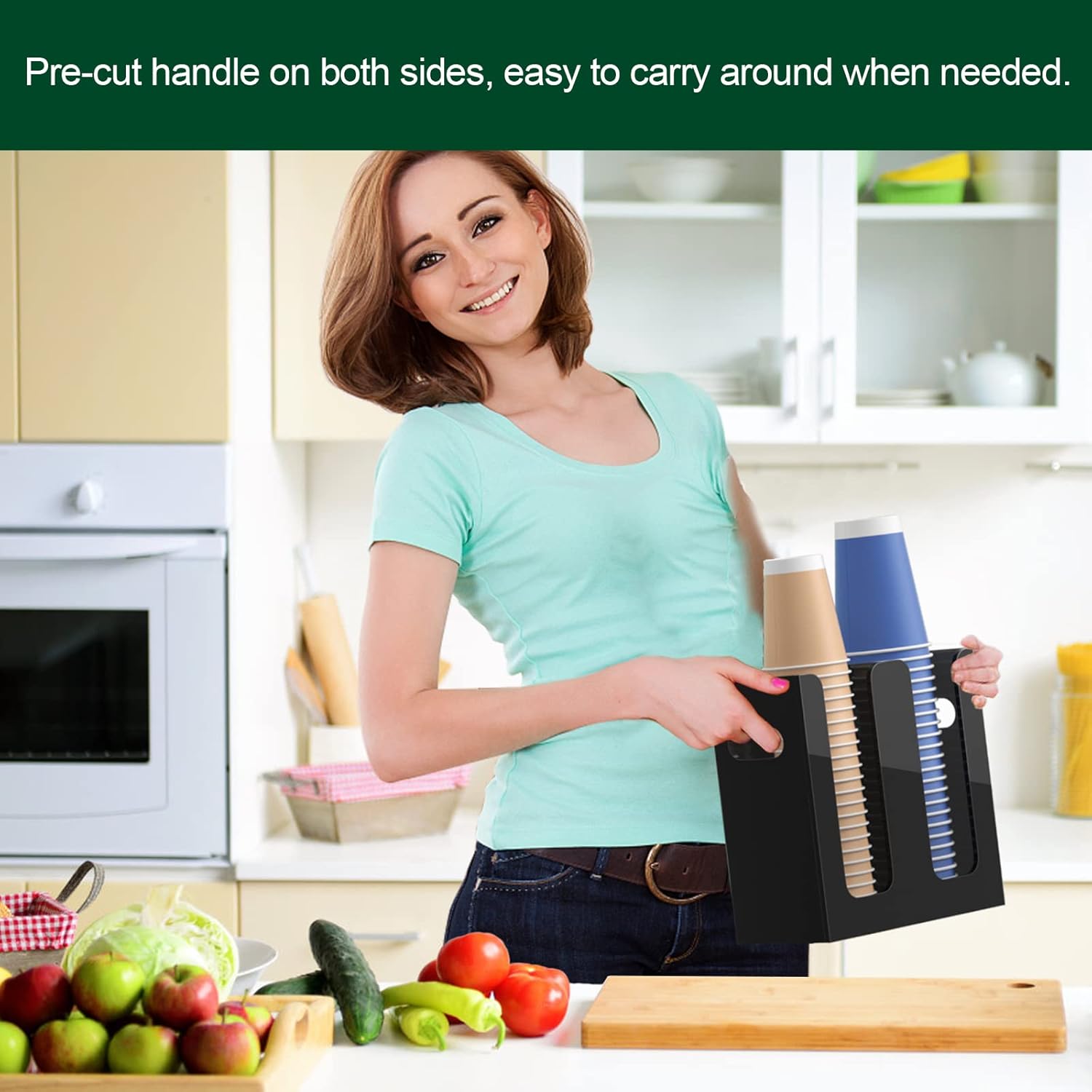 Disposable Coffee Cup Dispenser with Handles, Countertop or Wall Mount Hot/Cold Drink Cup and Lid Holder - Bathroom/Kitchen/Office Acrylic Cup Lid Storage Organizer (2 Compartments, Black)