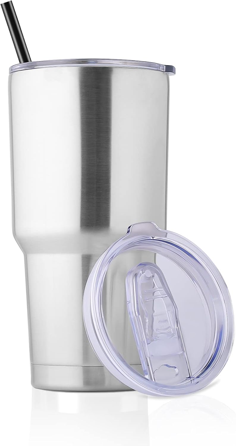 DOMICARE 30 oz Tumbler with Lid and Straw, Stainless Steel Tumblers Bulk, Insulated Vacuum Double Wall Travel Coffee Mug, Durable Powder Coated Tumbler Cup (Stainless Steel, 1)