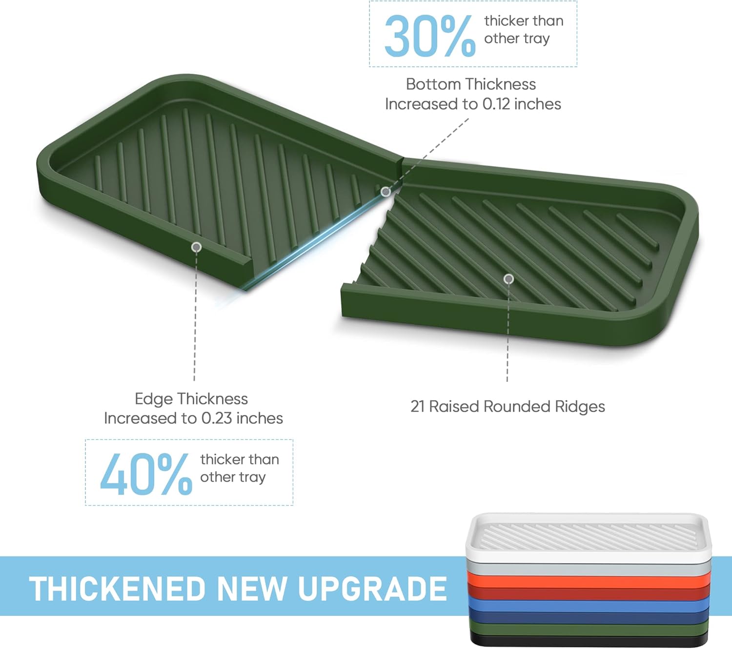 - 【Prominent Design】 Our kitchen sink organizer tray thickened the edges by 40% and the bottom by 30%, making the tray more thick and durable.Our silicone sponge holder has 21 rounded raised designs for easy cleaning and quick drying of soap or sponge.Raised edges prevent water or other spills, keeping the counter dry and tidy.The non-slip bottom design keeps the silicone tray stable on the sink or countertop and won't slide around.