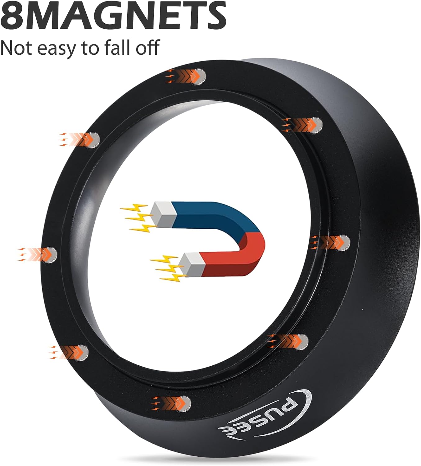 - 【The funnel with Magnetic Design】anodized aluminum ring has 6 magnetic points,can improve stability and effectively prevent the powder from spreading.you will be delighted at the simplicity of the application. Place it on your portafilter and it will lock into place instantly, convenient to place powder.