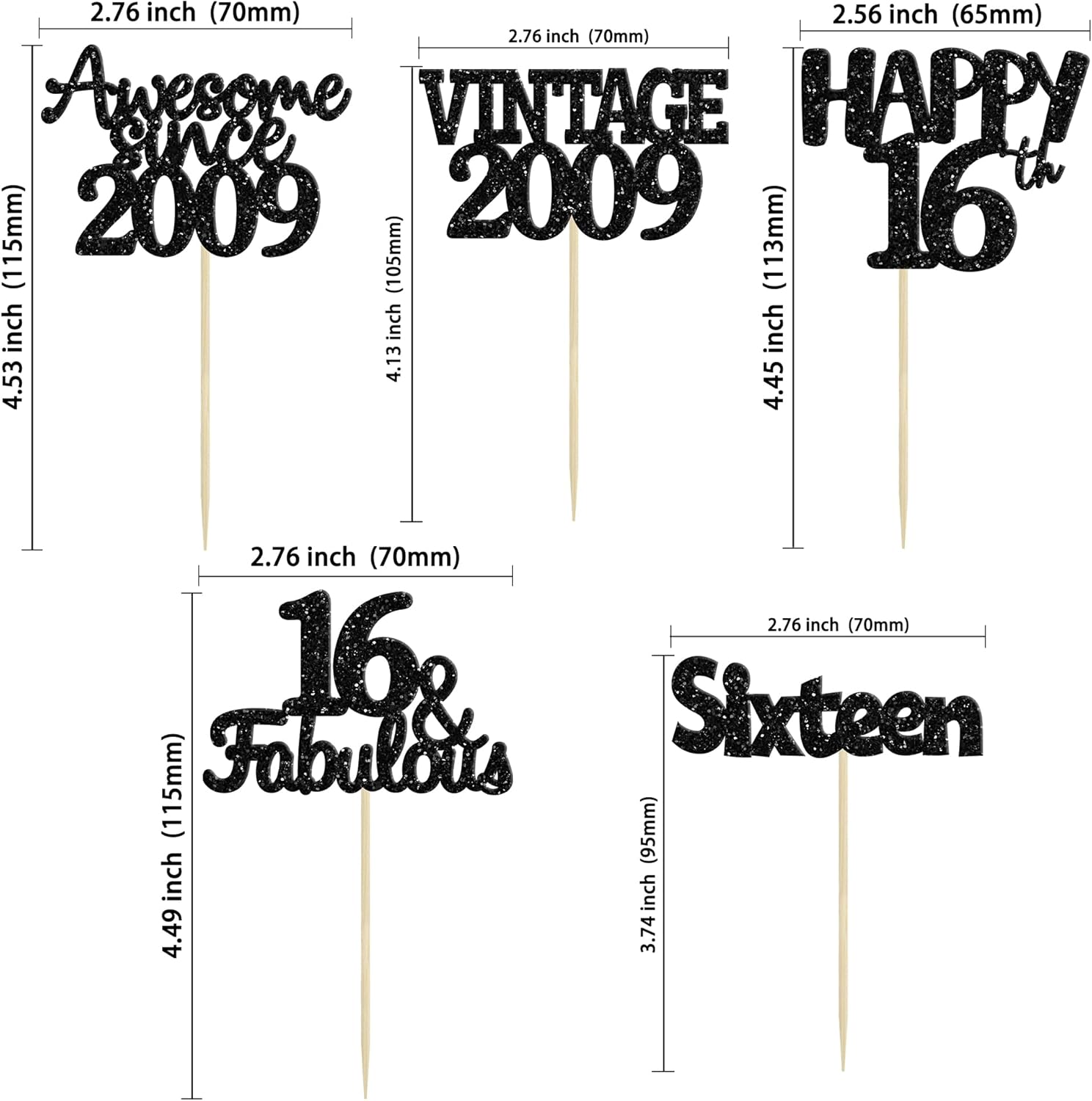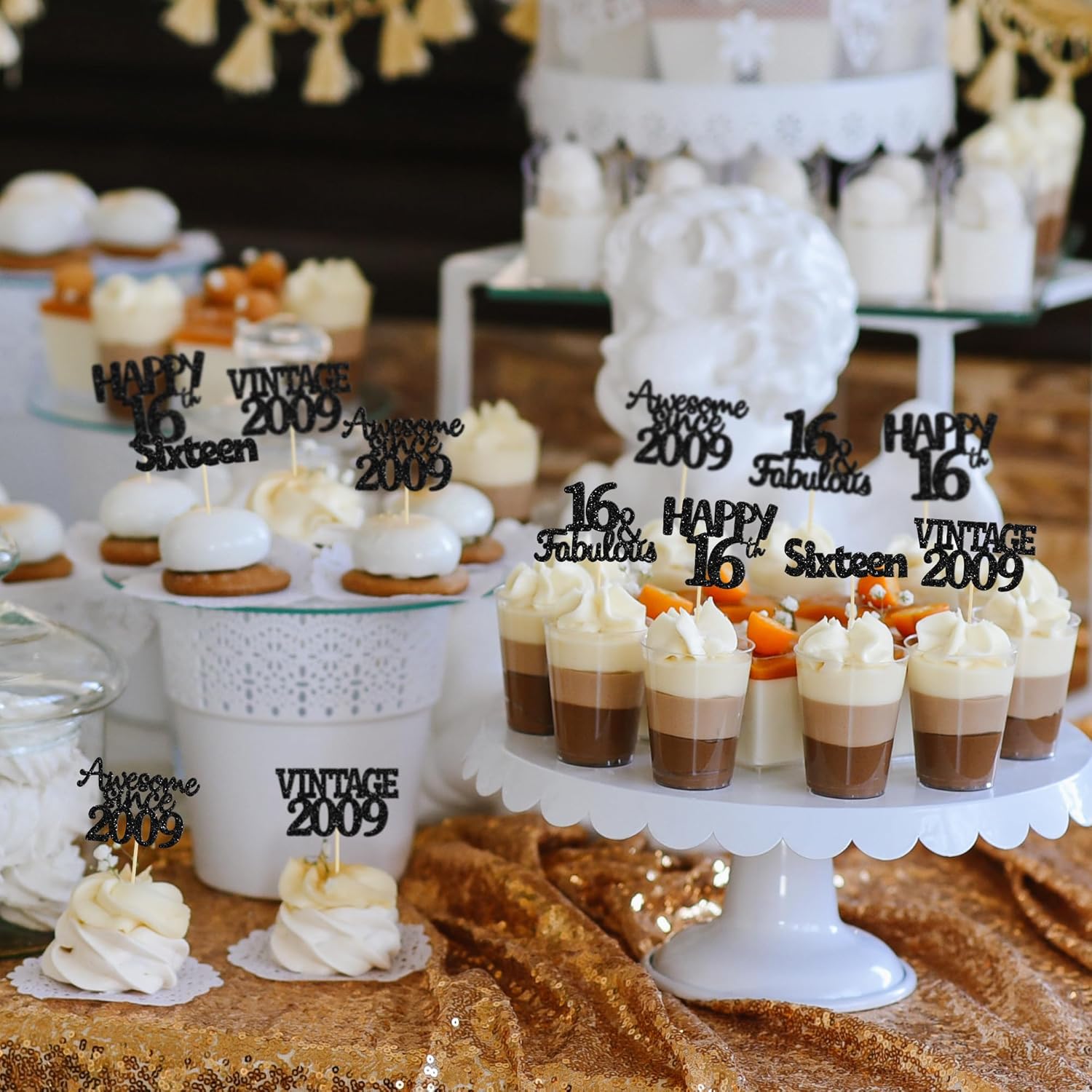 Gyufise 30Pcs Vintage 2009 Cupcake Toppers Glitter Sweet 16 Happy 16th Birthday Cake Decorations for Happy 16th Birthday Fabulous Anniversary Party Supplies Black