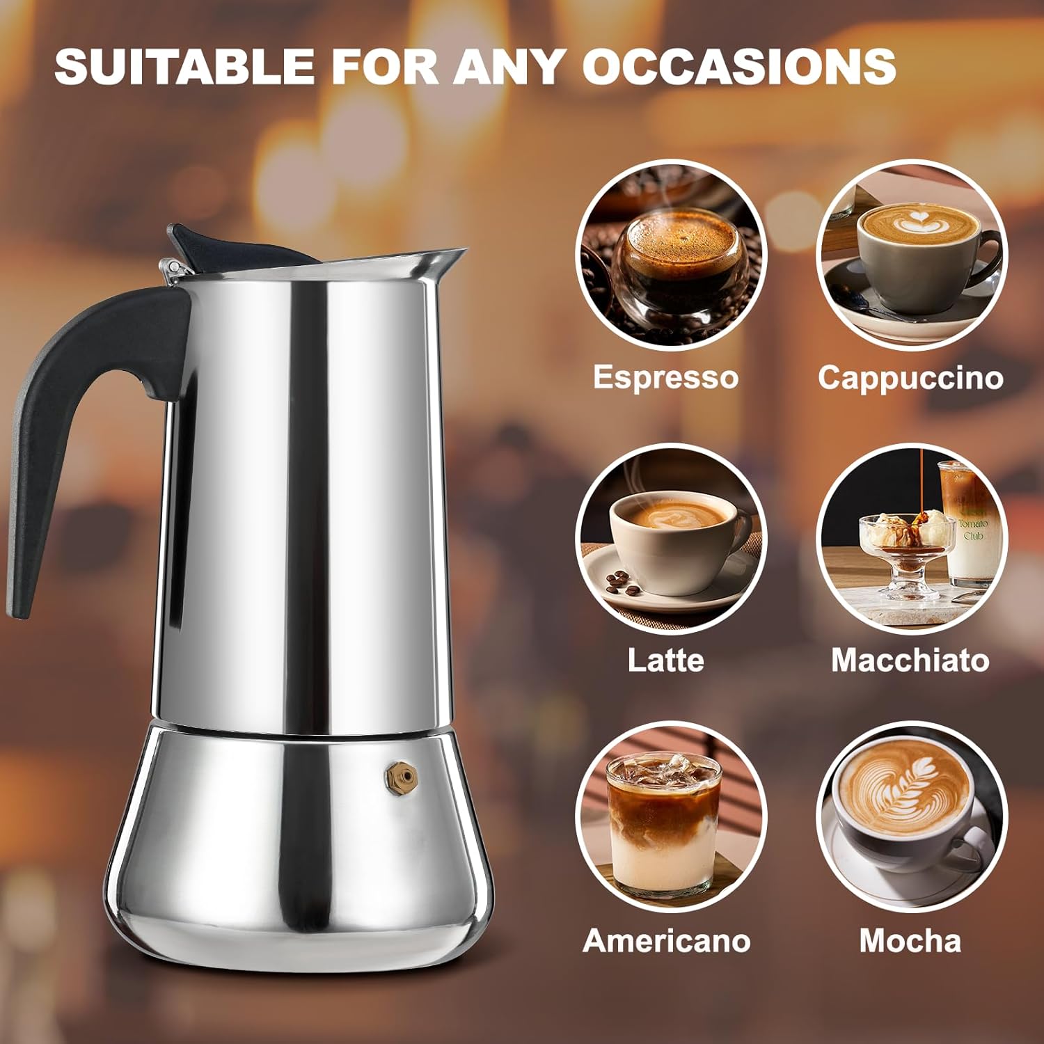 4 Cup Stovetop Espresso Maker Stainless Steel Moka Pot Stove Top Percolator Italian Coffee Makers Capable Mocha Greca Machine Cafe Classic Induction Cookers for Home and Camping 200ml 6.6oz