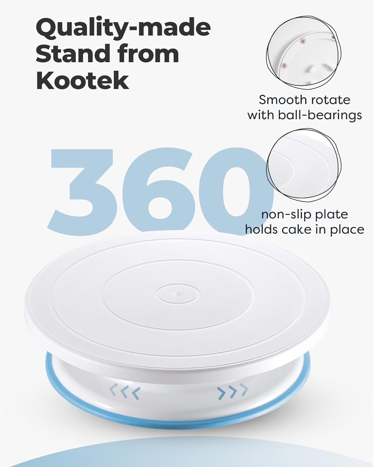 - 360° Spinning Cake Turntable: The cake turntable has an 11-inch diameter and 3-inch height and spins smoothly on a hidden ball bearing, making it easy to achieve stunningly consistent patterns and gorgeous designs. With 360º clockwise and counterclockwise spinning, you can decorate cakes like the pros.