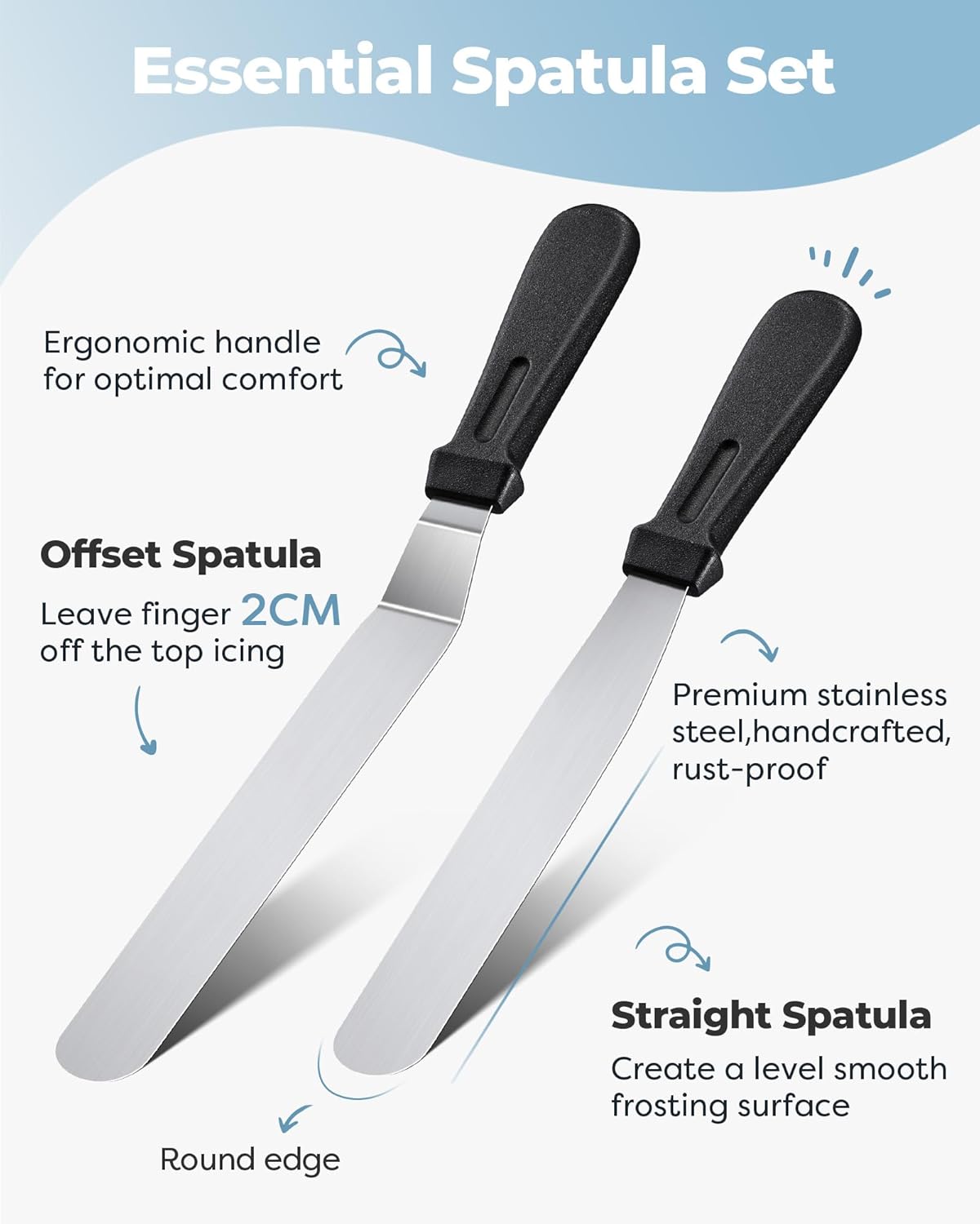 - Straight and Angled Frosting Spatulas: These high-quality stainless steel frosting spatulas make it easy to even out frosting and work on layered cakes. With a 12.5-inch angled spatula and a 10.6-inch straight spatula, you can create even crumb layers and perfect surfaces.