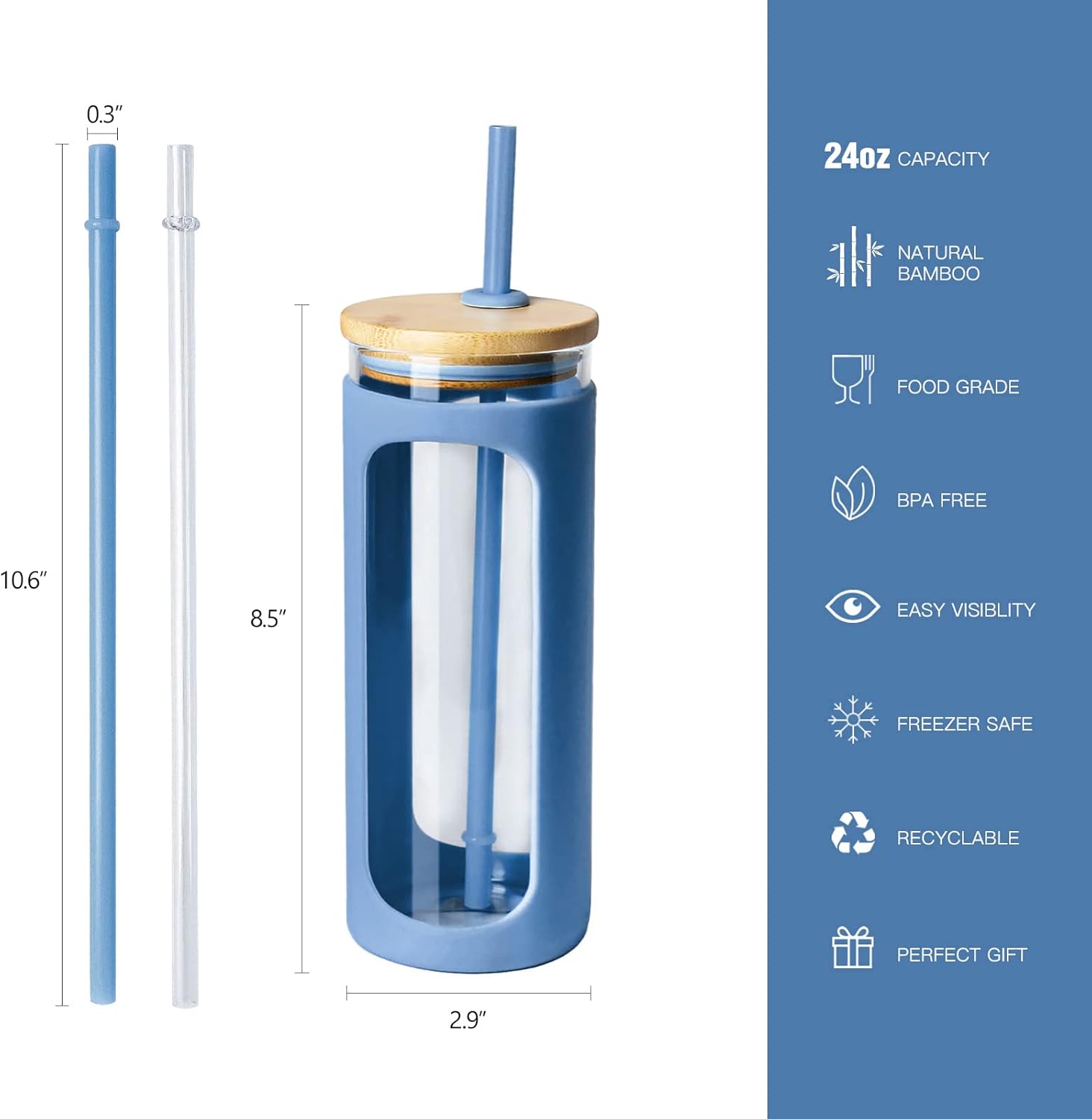 - MADE OF FOOD GRADE SILICONE: Glass cup with lid and straw features with nonslip silicone sleeve, which is a non-toxic material that does not contain any chemical fillers or byproducts, making it safe for use. The 20 oz Glass Tumbler is 2.9"- 7.4", which can fit in most car cup holders. With a wide mouth slot, you can easily put coffee powder,ice cubes,fruit,smoothies etc. which is also easier to clean