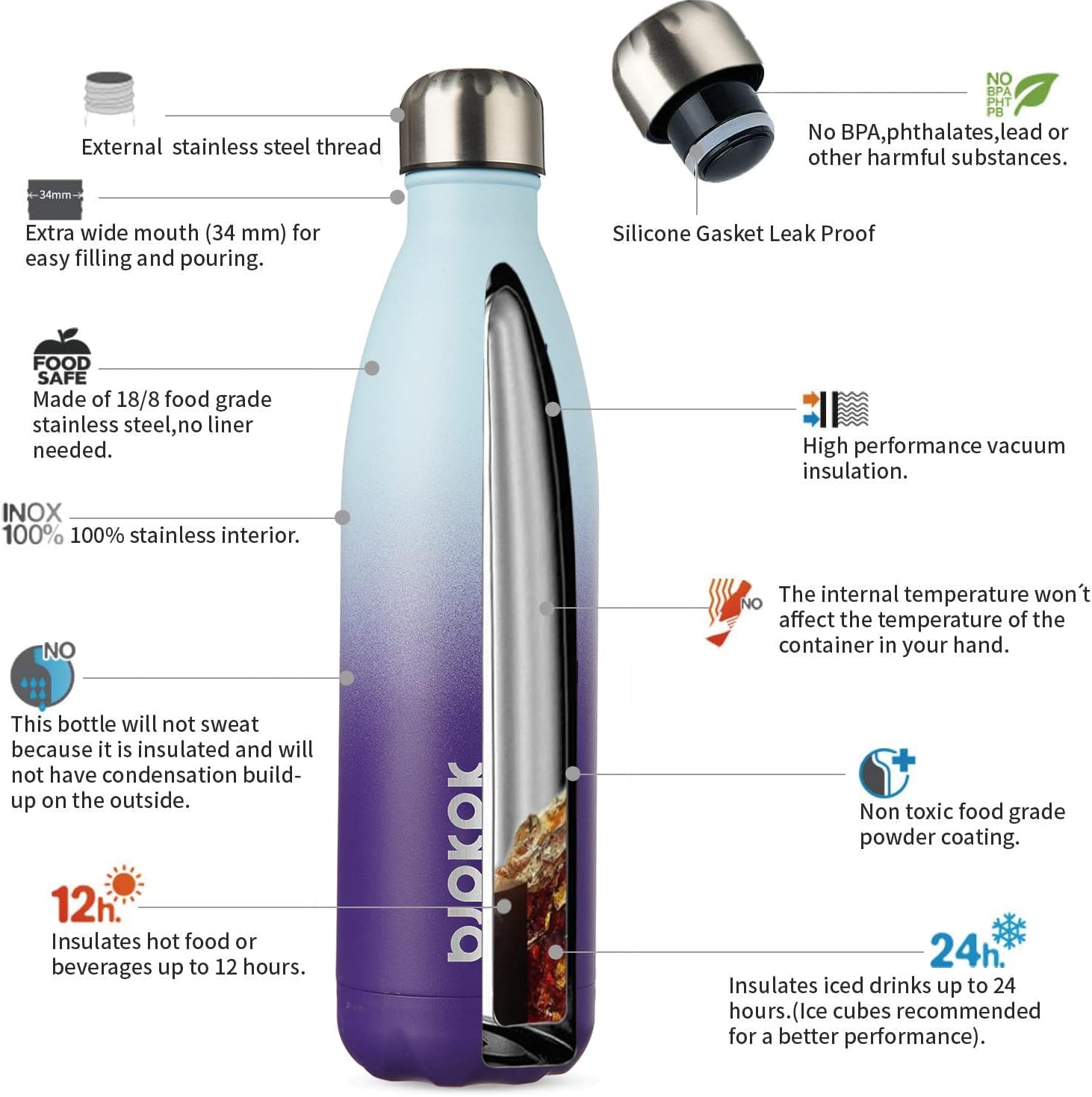 - Keep Drinks Cold & Hot: Adopt double wall vacuum insulation design, keep your drinks ice cold for 24 hours and hot for 12 hours within our highly performed insulated water bottle