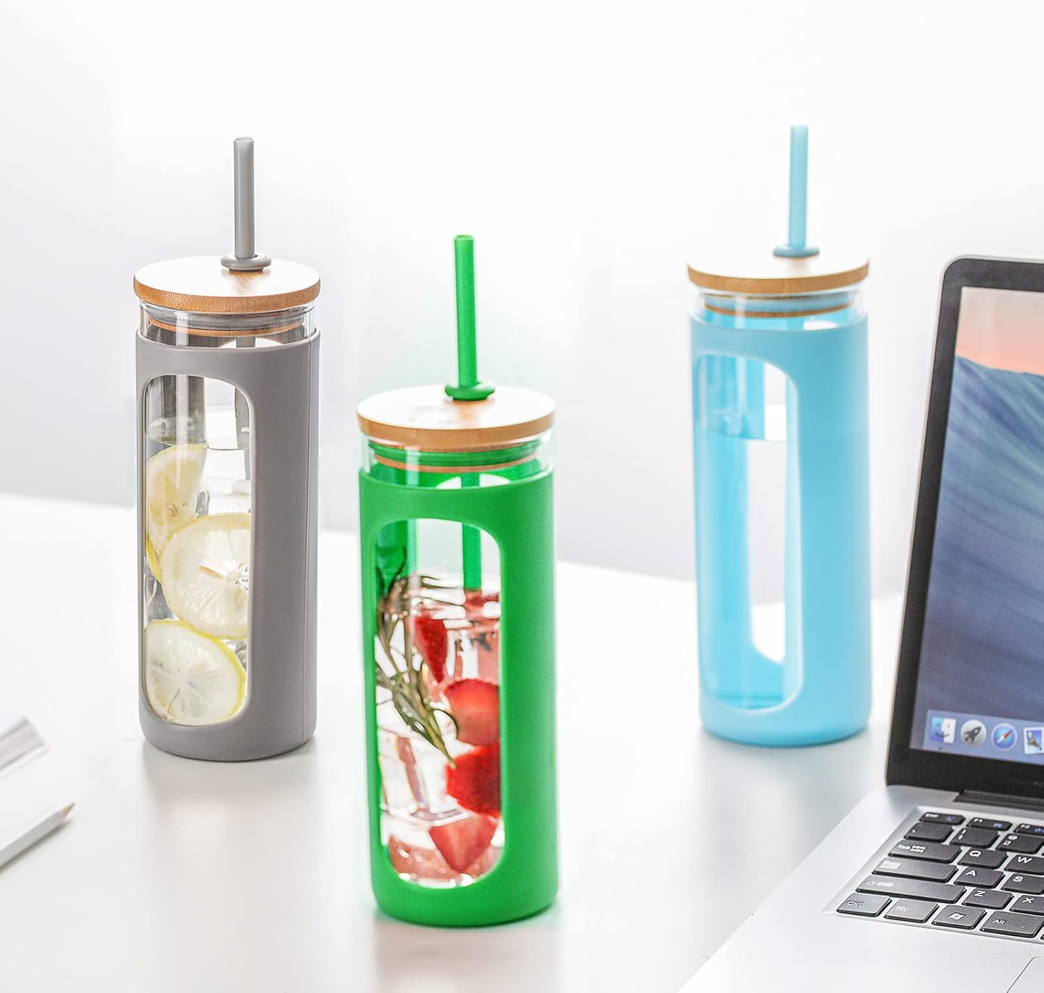 - MADE OF FOOD GRADE SILICONE: Glass cup with lid and straw features with nonslip silicone sleeve, which is a non-toxic material that does not contain any chemical fillers or byproducts, making it safe for use. The 20 oz Glass Tumbler is 2.9"- 7.4", which can fit in most car cup holders. With a wide mouth slot, you can easily put coffee powder,ice cubes,fruit,smoothies etc. which is also easier to clean
