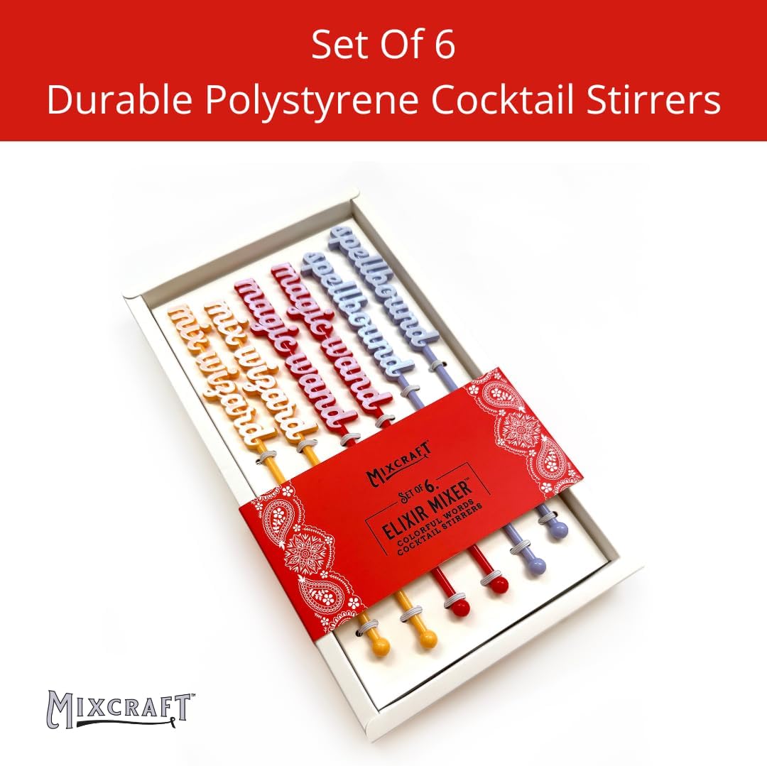 Elixir Mixer Cocktail Stirrers, Drink Stirring Swizzle Sticks, Colorful Words, Set of 6
