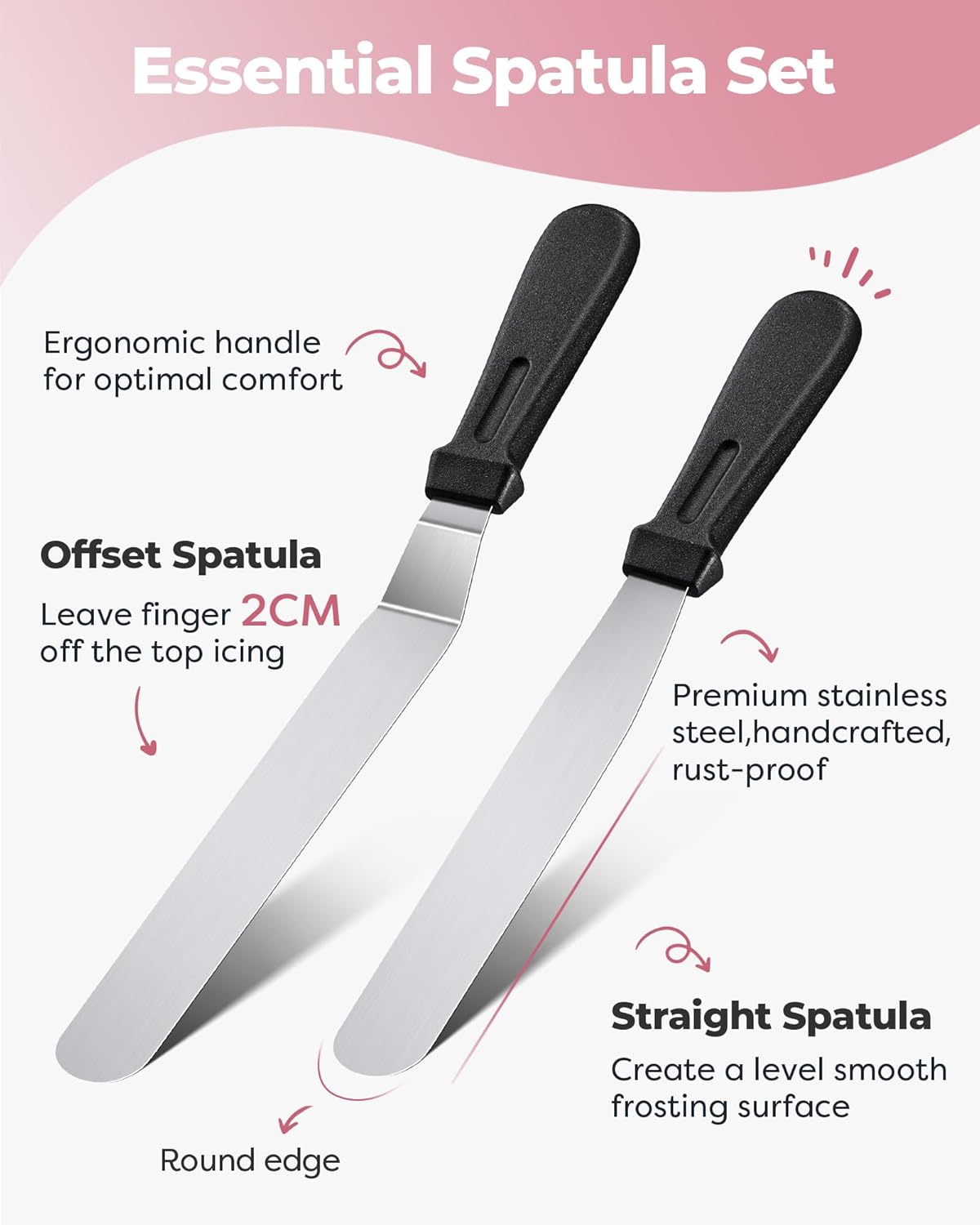 • Straight and Angled Frosting Spatulas: These high-quality stainless steel frosting spatulas make it easy to even out frosting and work on layered cakes. With a 12.5-inch angled spatula and a 10.6-inch straight spatula, you can create even crumb layers and perfect surfaces.