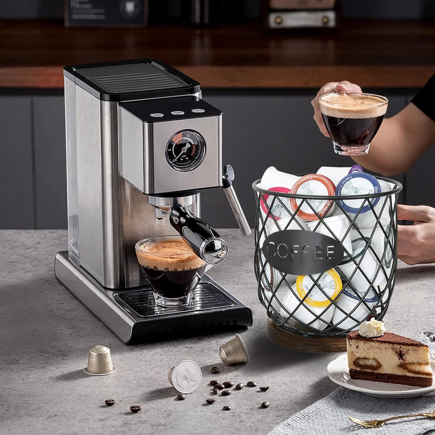 - Charming Design Style: This coffee pod holder boasts a charming design with frosted surface iron wire and brown wood panels. It adds a vintage texture to your coffee bar and is perfect for those who enjoy organizing and decorating their space. The basket is easy to clean, but we suggest handwashing it only.