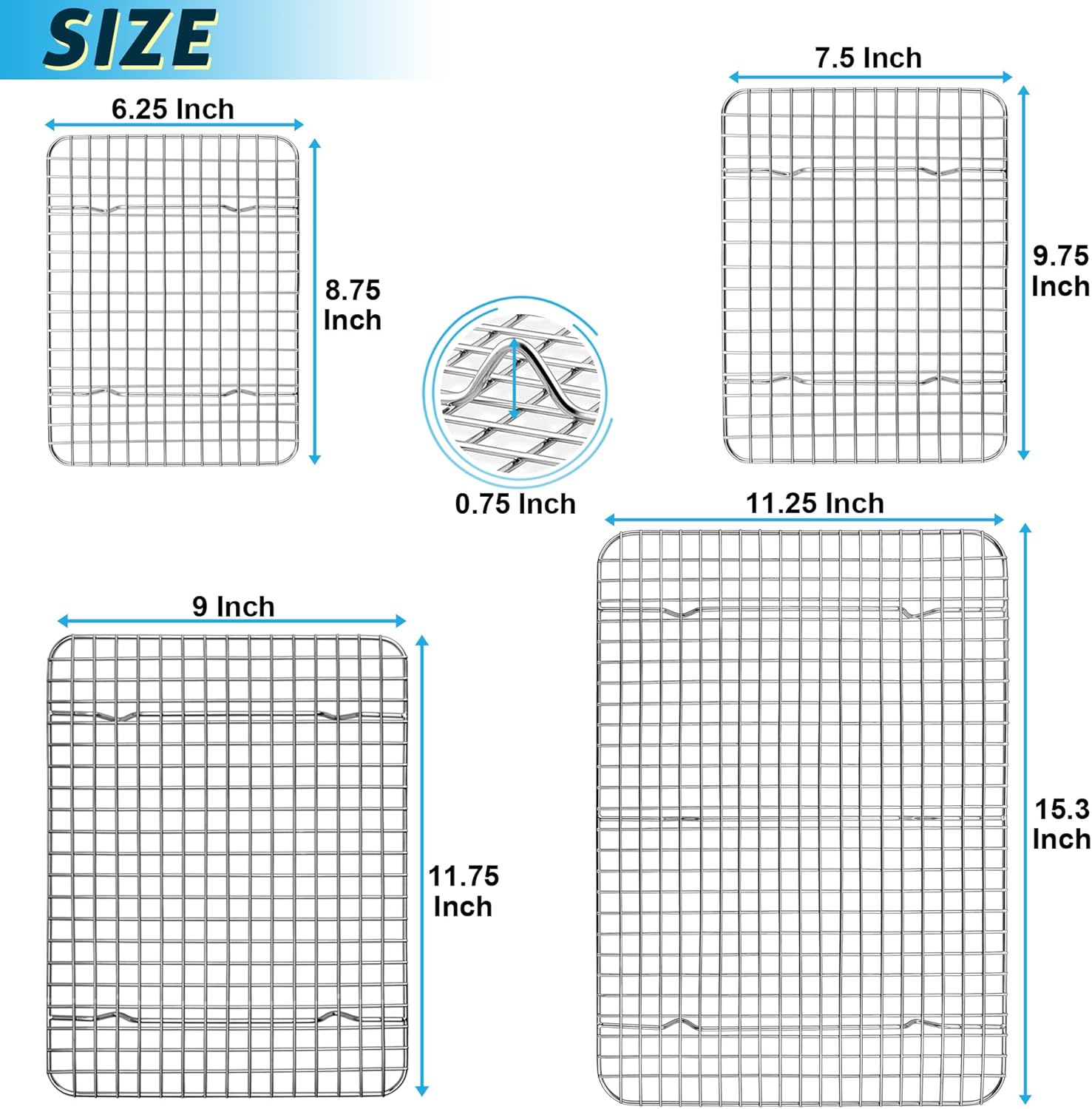 - 4 Sizes & Versatile: 4 sizes, Large: 15.3’’ x 11.25’’, Medium: 11.75’’ x 9’’, Small: 9.75’’ x 7.5’’, Mini: 8.75’’ x 6.25’’, Perfectly fit various size baking pans, Ideal for baking or cooling cookies, Roasting shrimp, Grilling and Smoking bacons / kabobs, Decorating donuts, Dripping grease, An economical choice for daily use