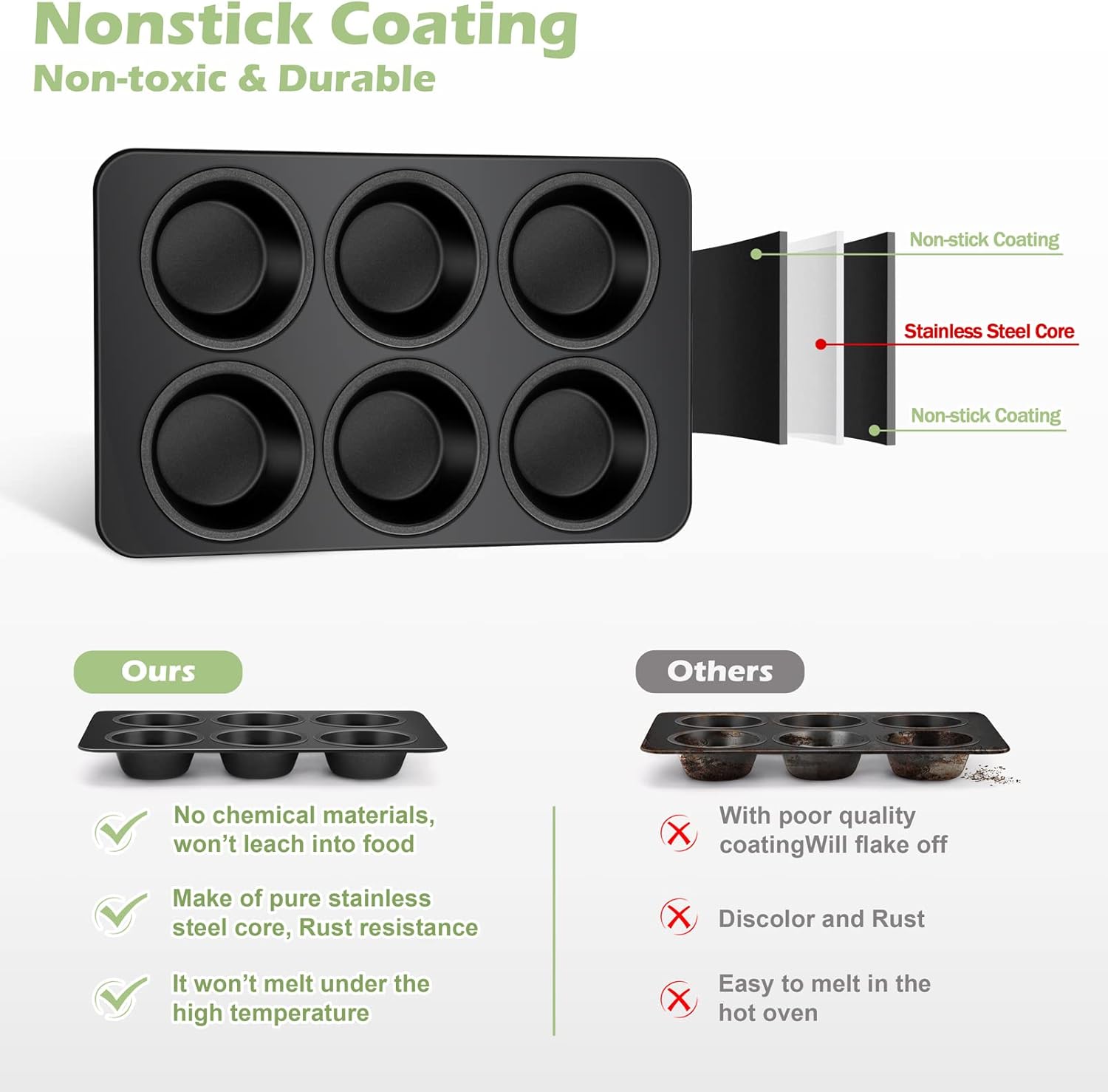TeamFar Muffin Pan, 6 Cup Muffin Tin Cupcake Pan Tray with Nonstick Coating and Stainless Steel Core, for Home/Kitchen Baking, Healthy & Heatproof, Release Easily & Easy Clean