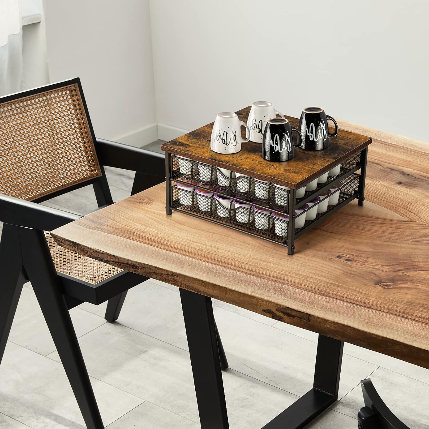 - Sturdy Cup Pod Holder: The coffee pod storage drawer is made of high quality wood top and sturdy metal frame, durable and easy to clean. It can be used in home and office lounges for your convenience experience. Size: 13.38”L x 12.8”W x 6.5”H.