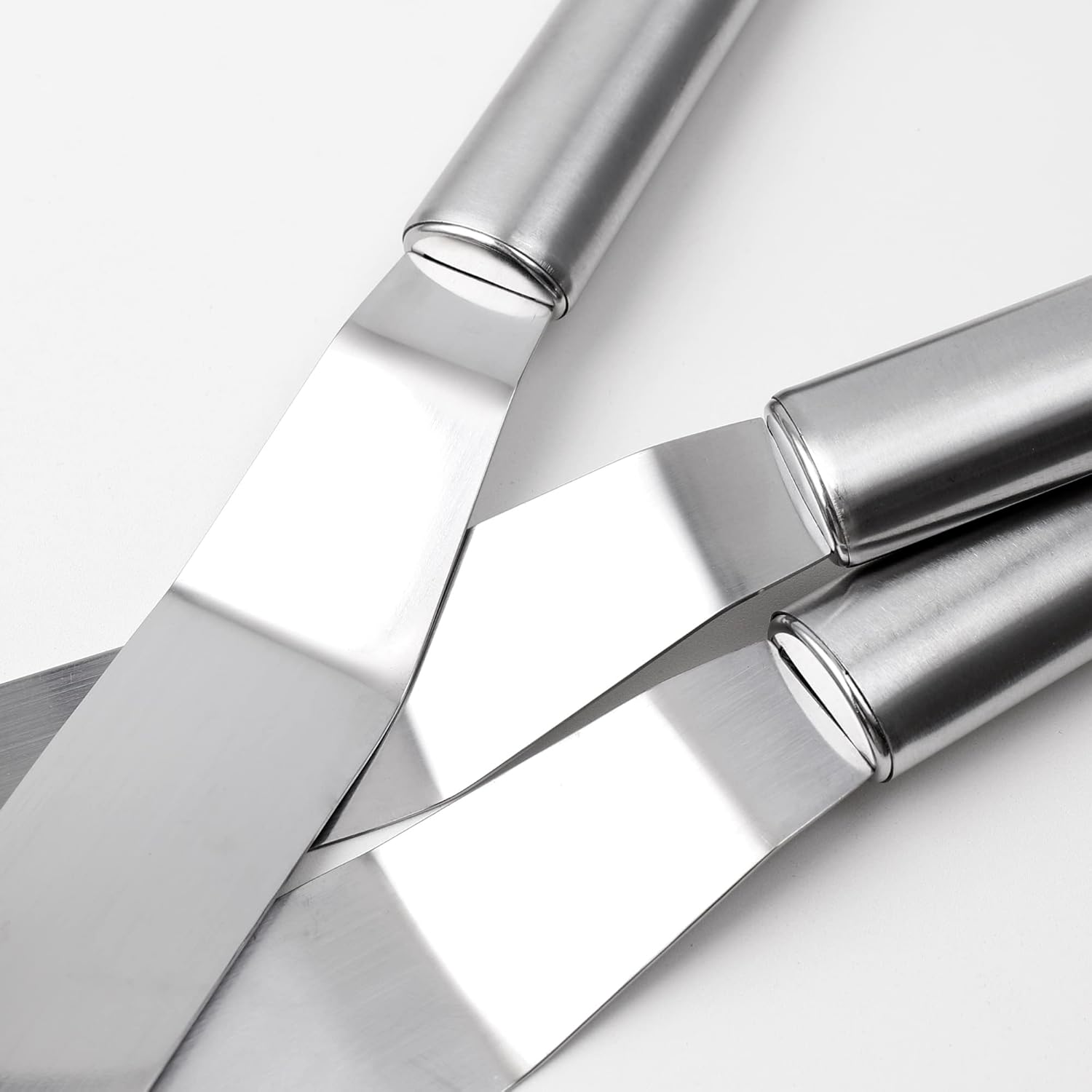- This set includes 6", 8", and 10" offset and straight cake decorating spatulas for easy frosting, reaching hard-to-get areas, and keeping your hands clean.