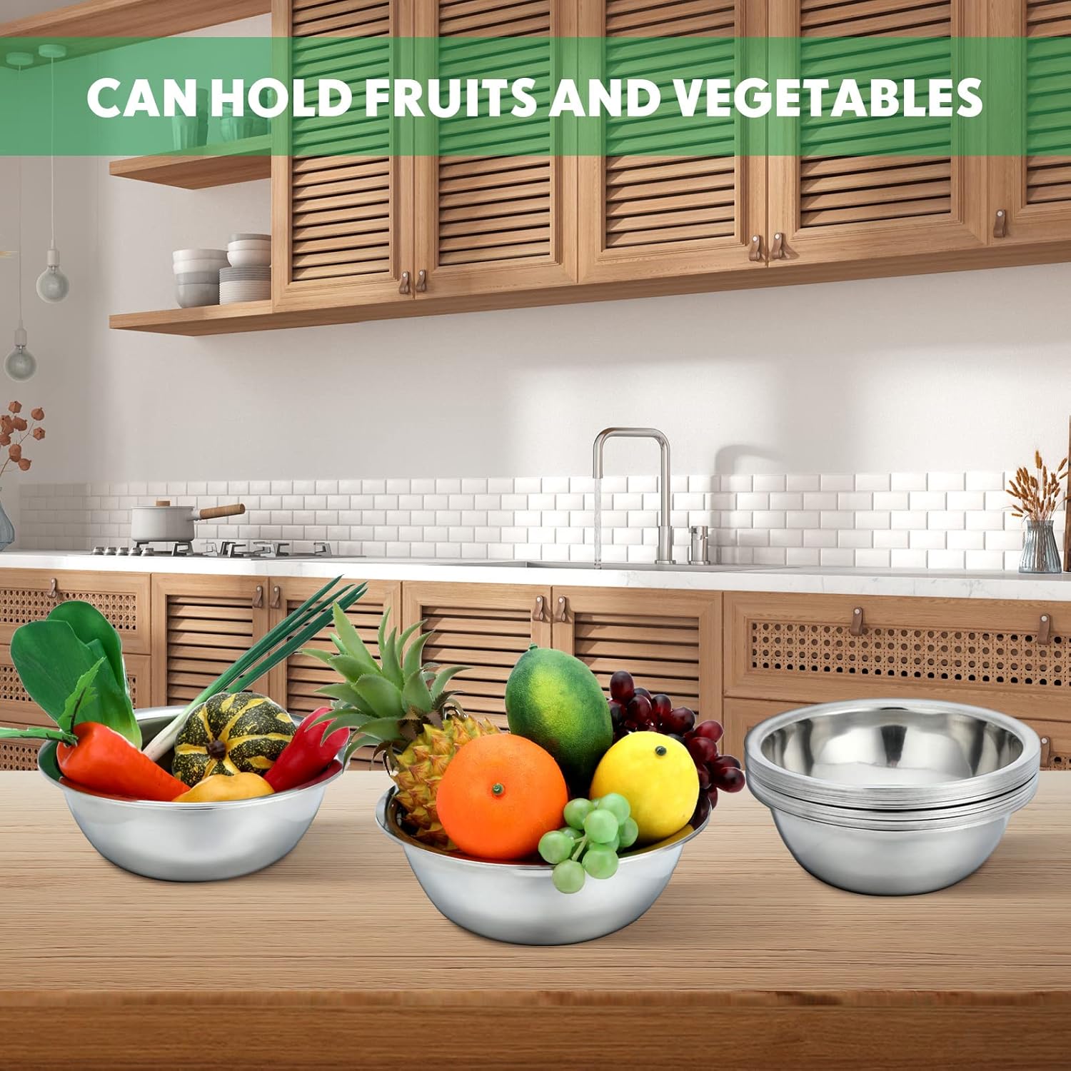 - Stainless Steel Mixing Bowl Set: what you will receive are 12 pieces of stainless steel bowls for mixing in silver color, metal food prep bowls are about 8.66 x 8.66 x 3 Inches/ 22 x 22 x 7.7 cm, which can be applied as both baking mixing bowls and serving bowls adequate quantity can well meet your daily use, replacement and sharing demands
