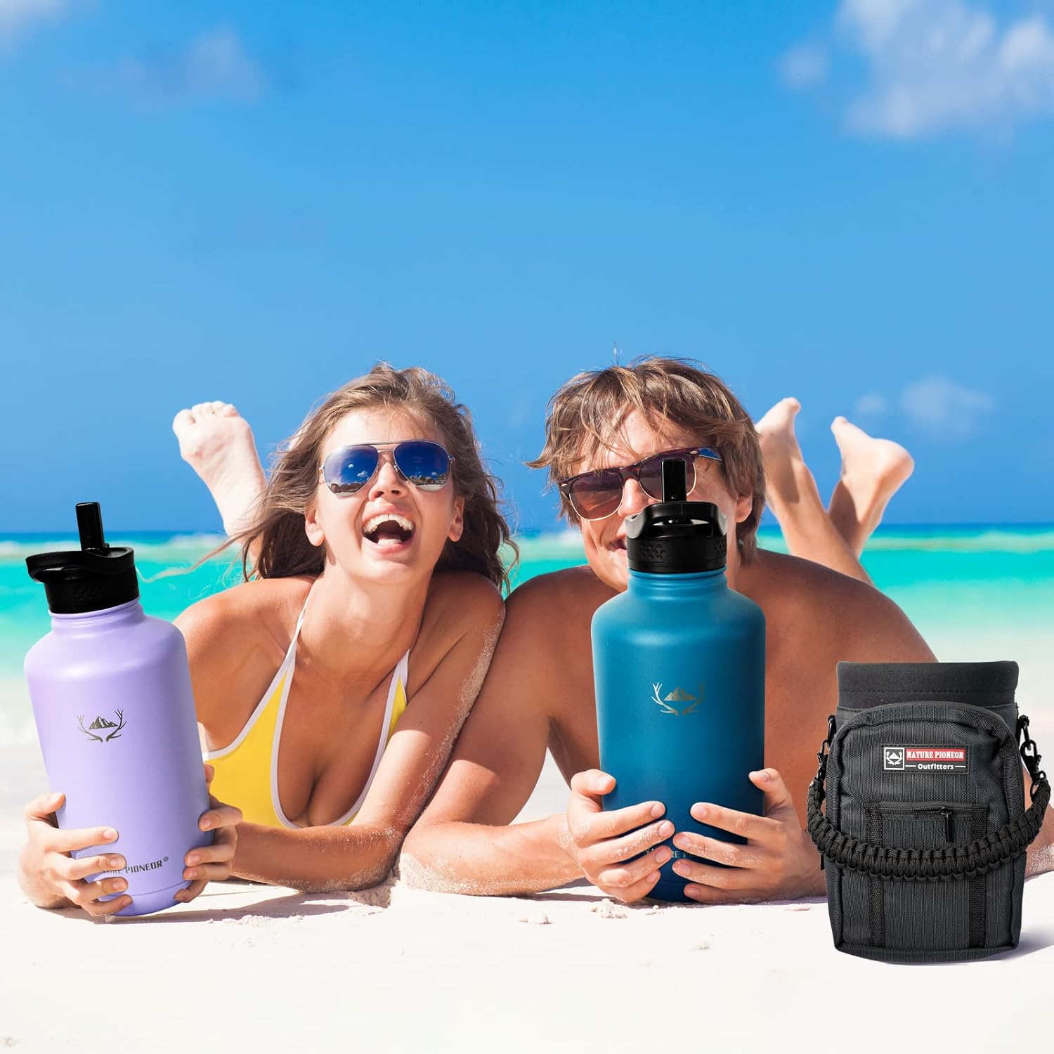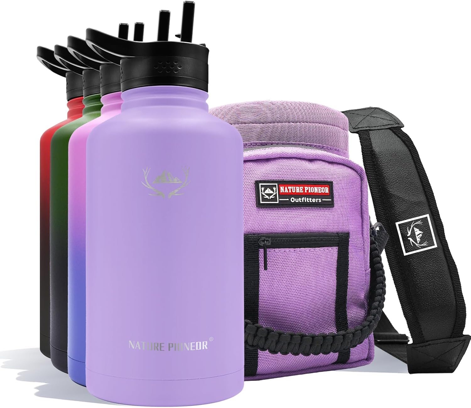 NATURE PIONEOR Insulated Water Bottles with Straw - 64oz Stainless Steel Vacuum Bottle with Holder/Carrier/Sleeve - Reusable 18/8 Food Grade Half Gallon Water Jug