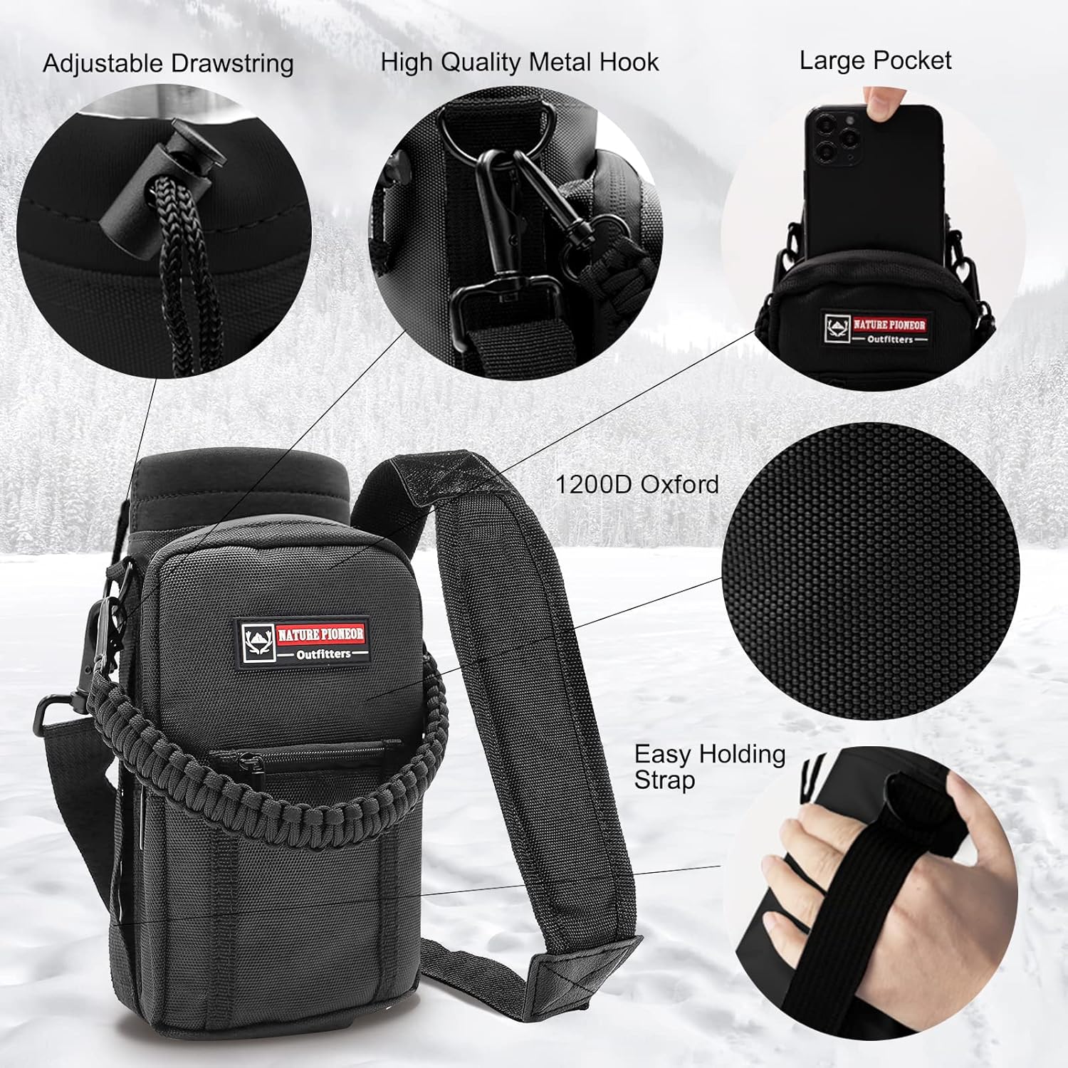 - 【Portable Water Bottle Holder】 – To make carrying easier, this water bottle comes with a handmade paracord handle and adjustable shoulder strap for hands-free convenience. The holder includes a zippered storage pocket for small items like keys, cards, or snacks, and a side hook for accessories. Whether you’re going on long hikes, outdoor adventures, or traveling, this bottle + carrier set offers both functionality and style