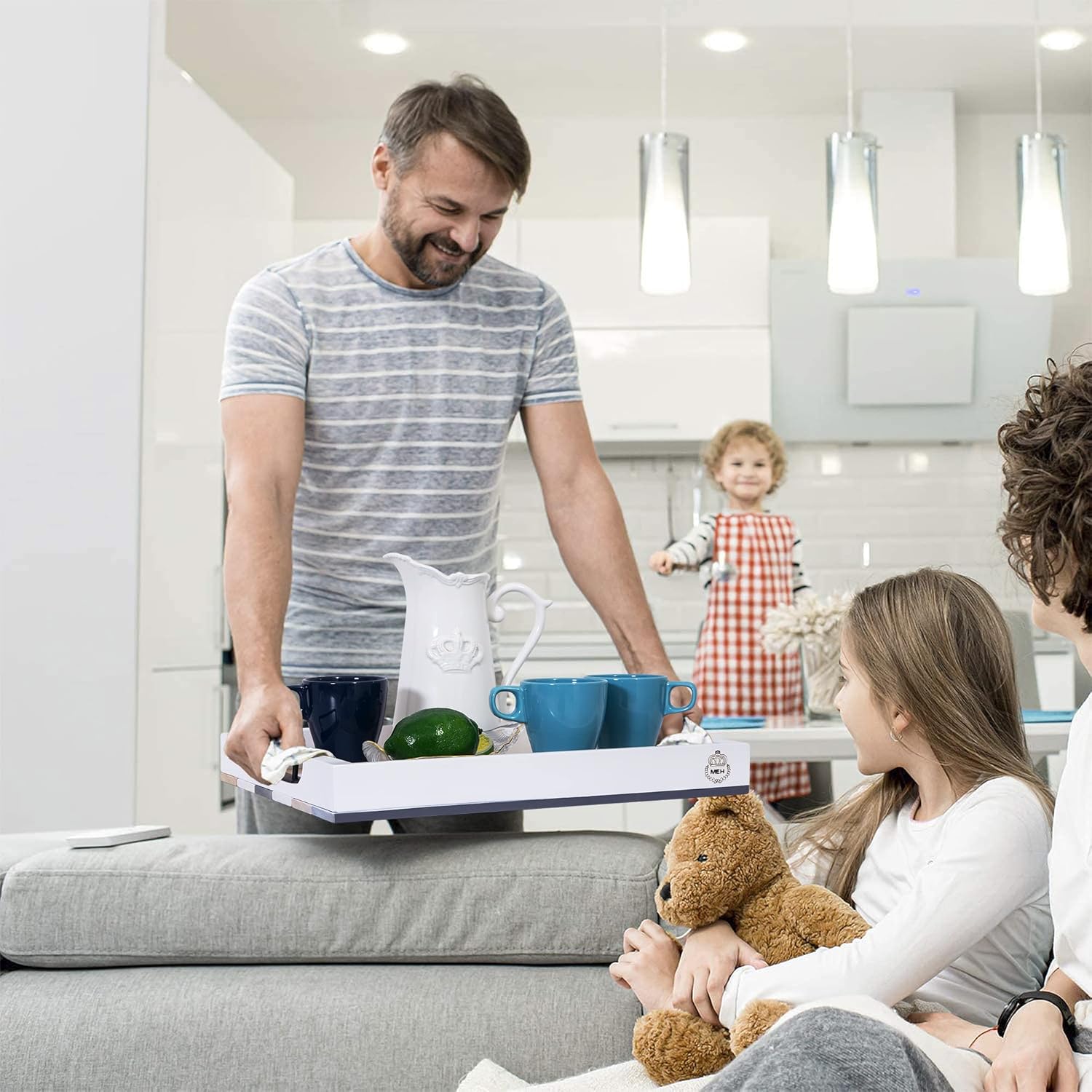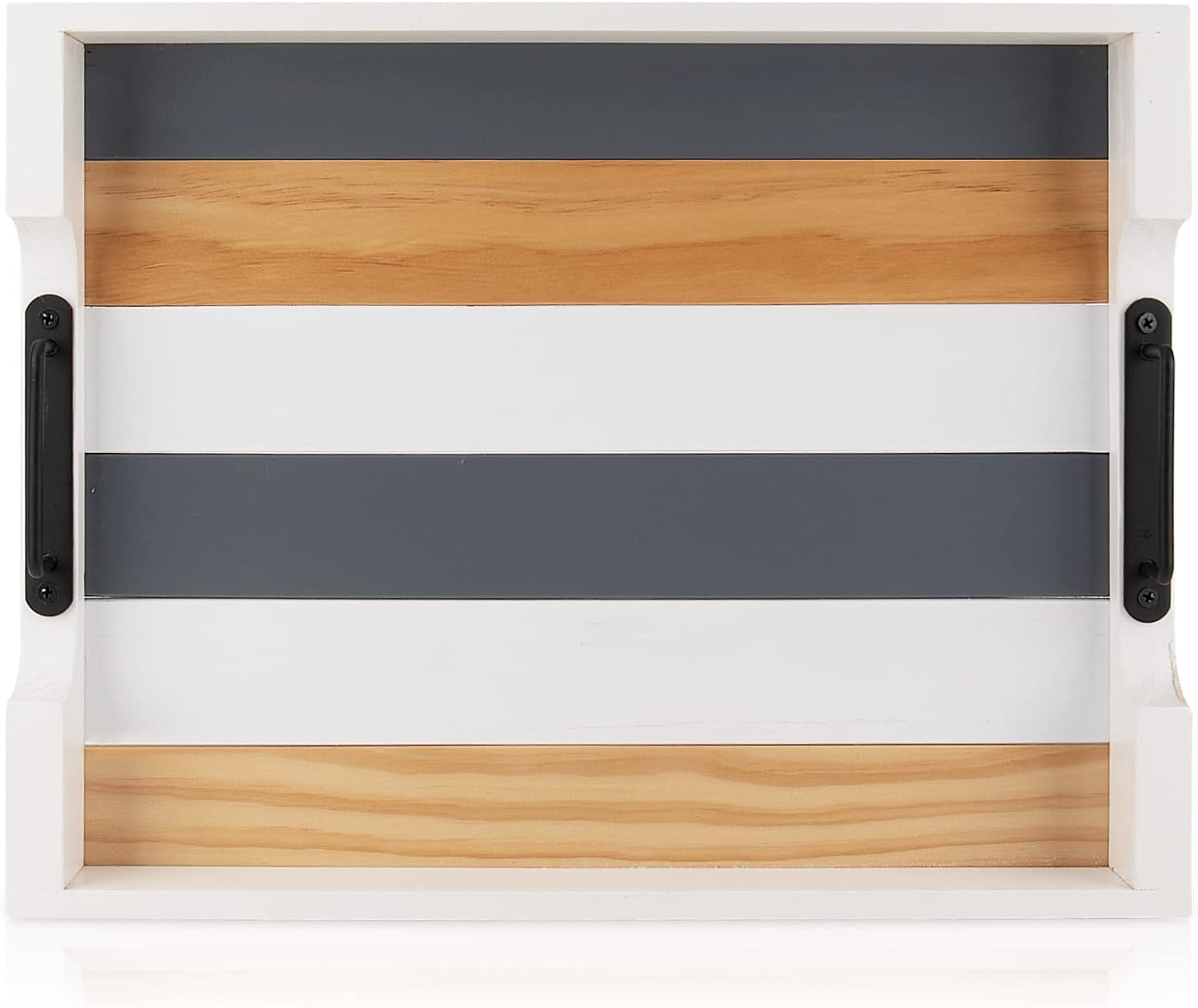 Wood Serving Tray with Metal Handle for Ottoman, Modern Rectangle Coffee Table Tray for Food Eating, White Decorative Tray, Size 17''x13'', Multicolor