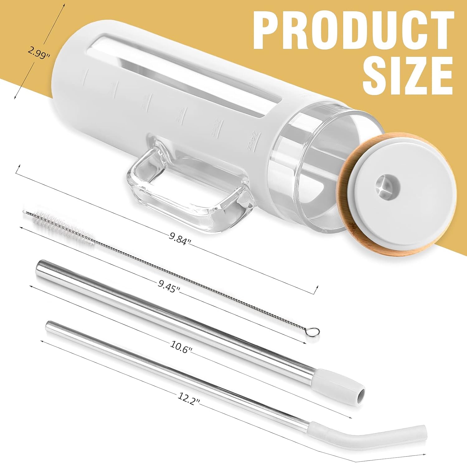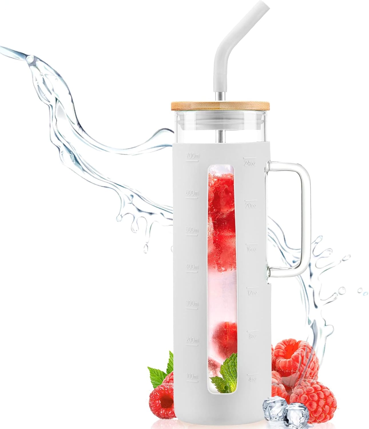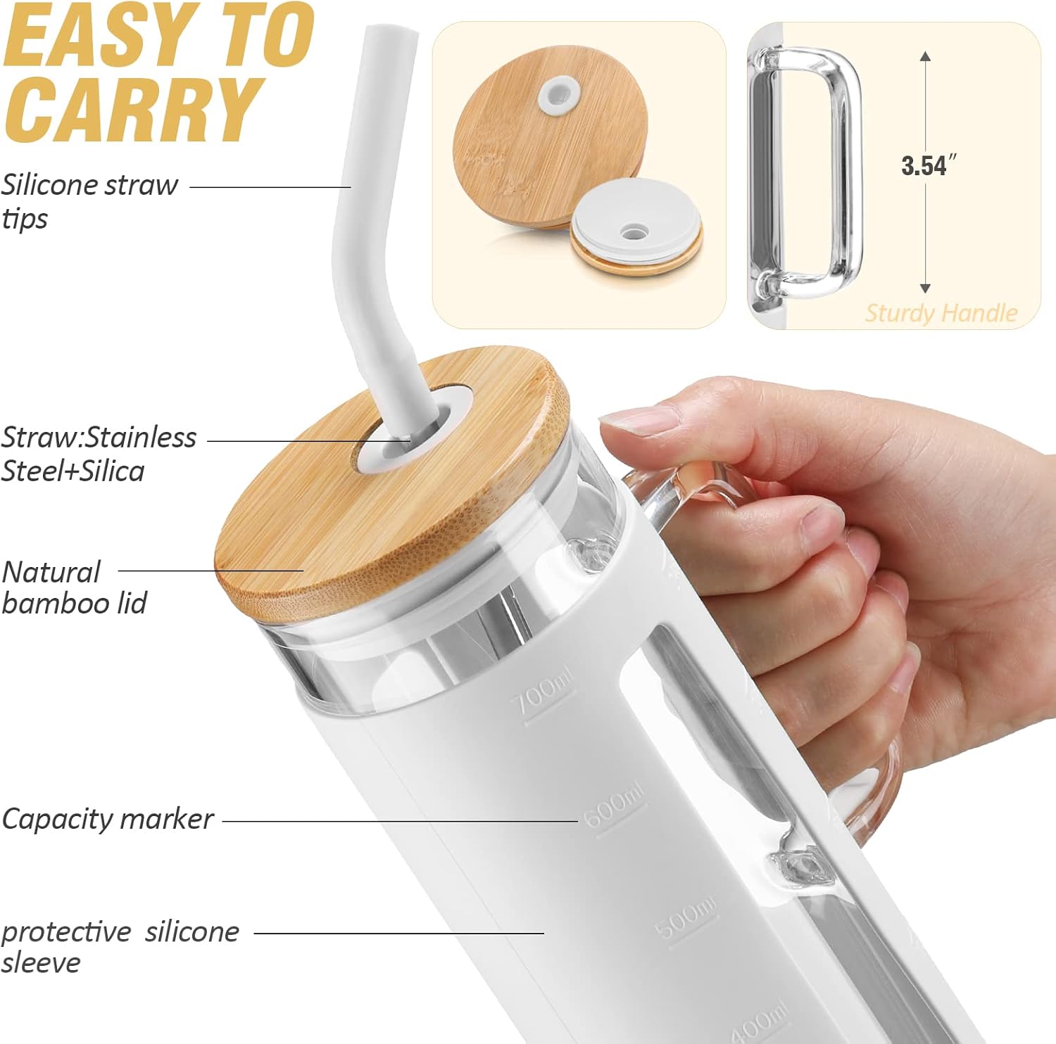 Kodrine Tumbler with Lid and Straw, 24 oz Glass Tumbler with Handle, Iced Coffee Cup Boba Smoothie Cup, Coffee Tumbler Water Tumbler Cups with Bamboo Lid Home Office Tumblers, White