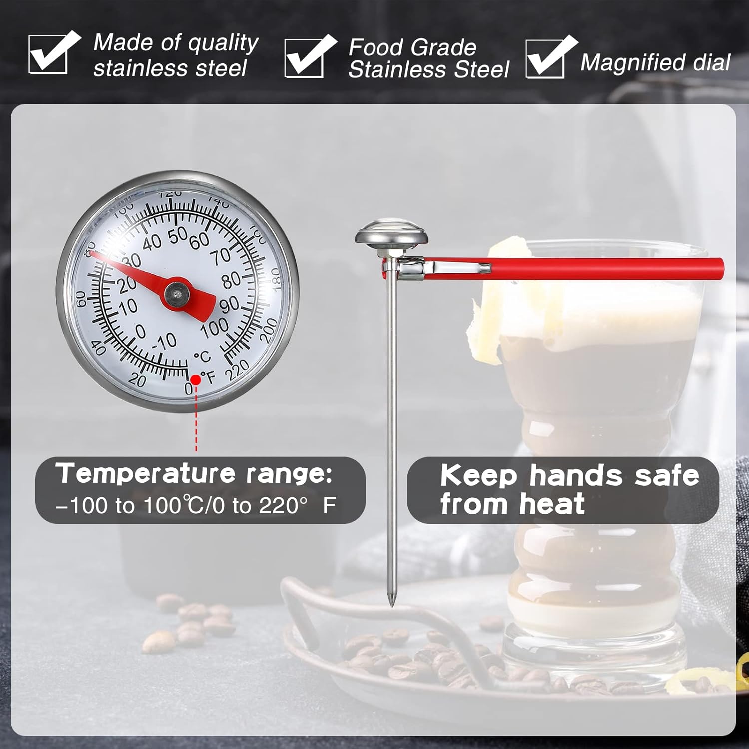 - Easy and Practical: with a fine material and a simple appearance, you can use our thermometer for cooking to measure the temperature of milk, coffee, drinks, red wine, tea, water and so on, easy and practical, a good helper in your kitchen