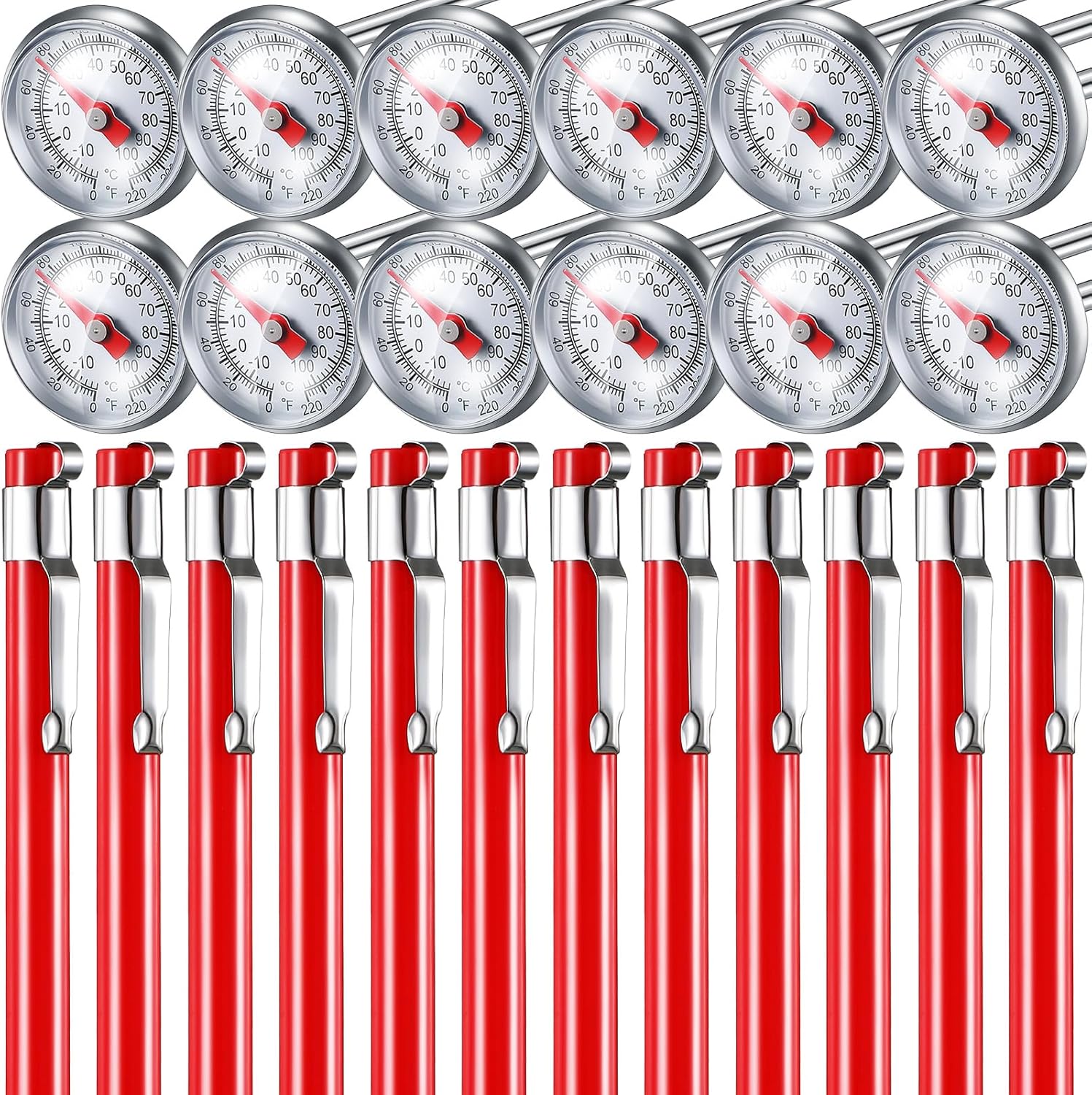 Xuhal 12 Pcs Stainless Steel Kitchen Thermometer with 5 Inch Long Stem 1 Inch Dial Thermometer Milk Frothing Food for Oven Probe Meat Grill BBQ Cooking Chocolate Water (Red)