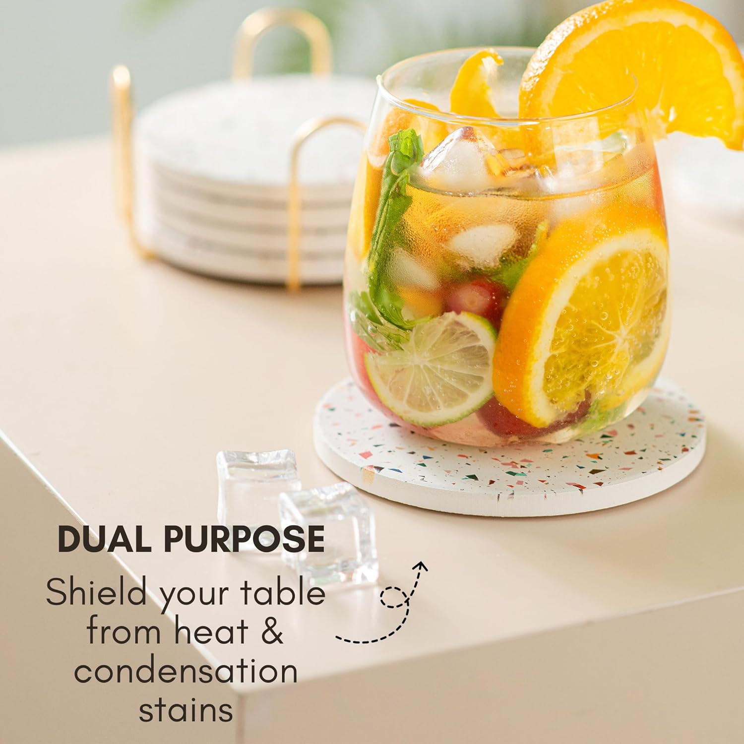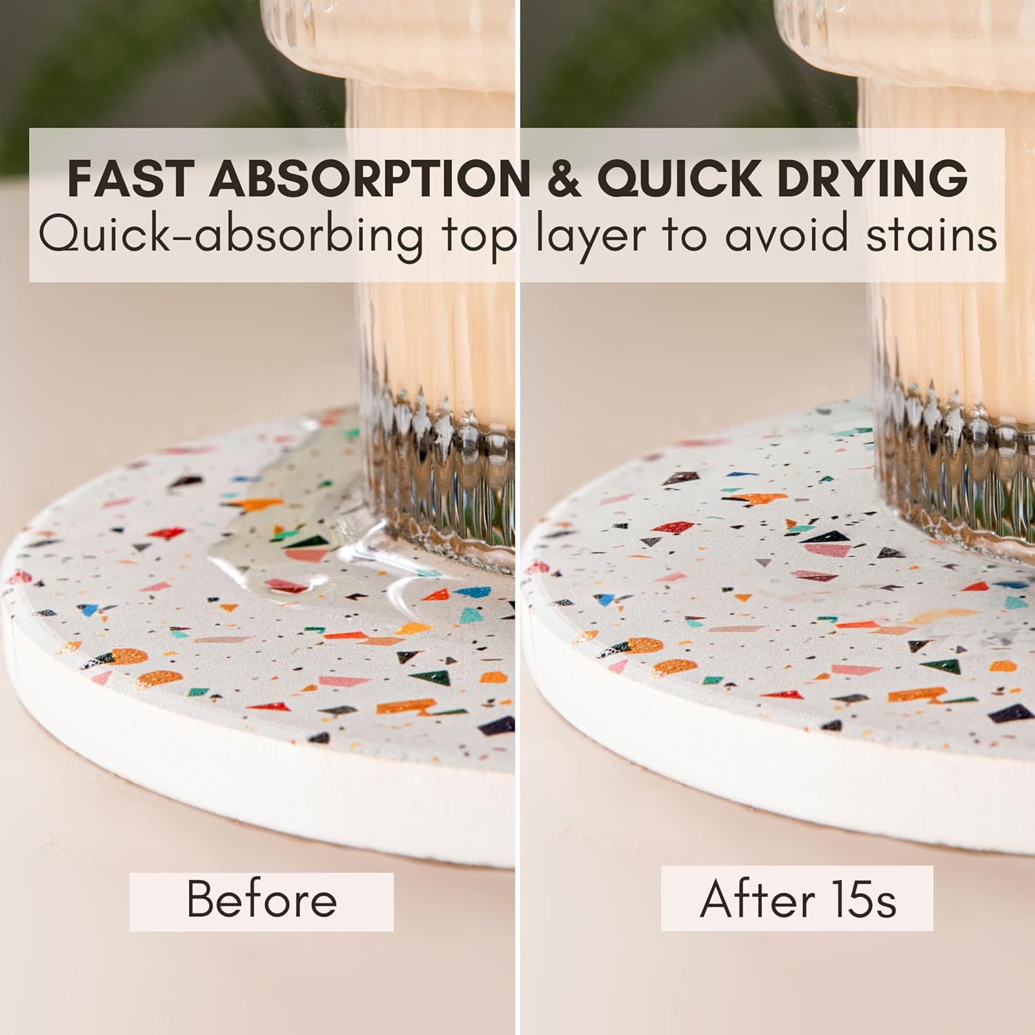 - Highly Absorbent for Hot & Cold Drinks: Our absorbent coasters are made of quality diatomite that absorbs condensation from cold drinks, spills from hot drinks and the absorbency will not detoriate over time.