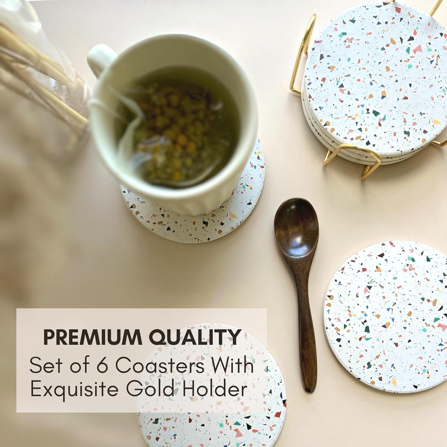 Terrazzo Drink Absorbent Coasters with Holder Set of 6, Ceramic Coaster for Drinks, Coffee Table Decor, Water Absorbing Stone Coaster for Drinks (Confetti)