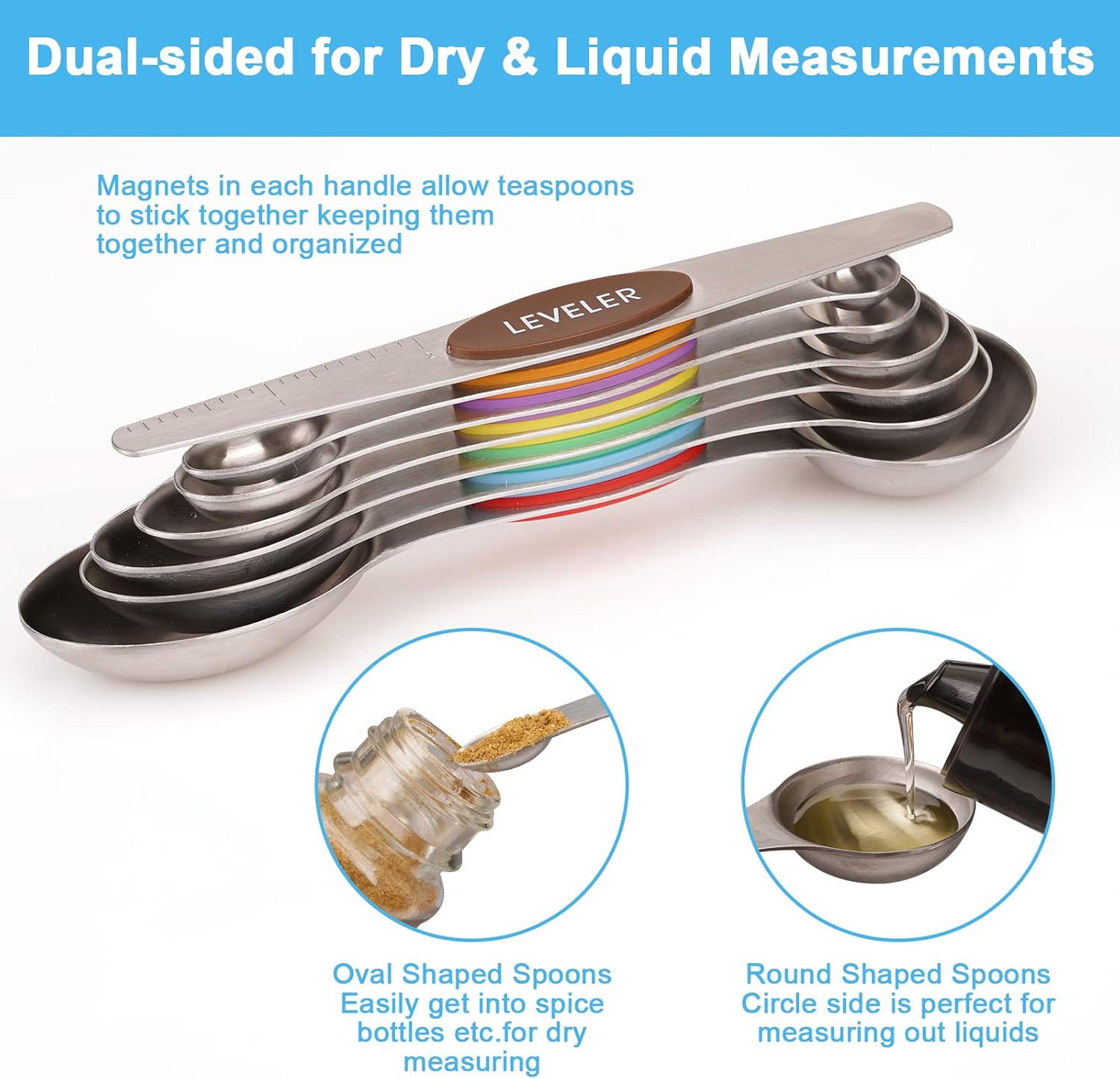 - 【Well-Designed 7-Piece Set】The Magnetic tablespoon set contains 6 metal measuring spoons: 1/8 tsp, 1/4 tsp, 1/2 tsp, 1 tsp, 1/ 2 tbsp, 1 tbsp, and 1 scraper. Dual sided: The oval end is narrow to fit into most spice jars. The round end is perfect for liquids. These stainless measuring spoons are great for measuring spice, sugar, salt, oil, coffee, wheat etc. Make your cooking and baking easier and more fun.