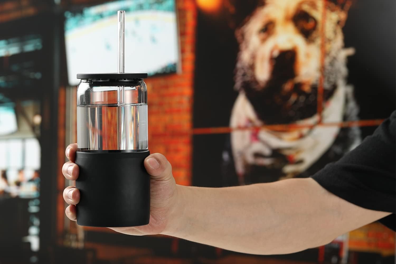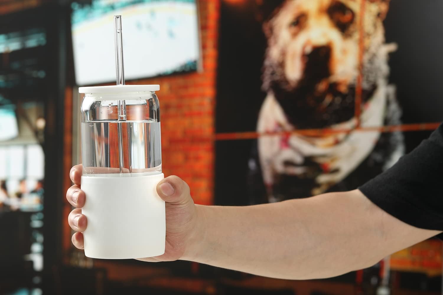 - The unique silicone sleeve and lid design provides a strong protection for the glass cup. if the glass cup is accidentally turned over on the desktop, the chance of breaking is very small, and the sealed lid ensures that the liquid will not overflow.