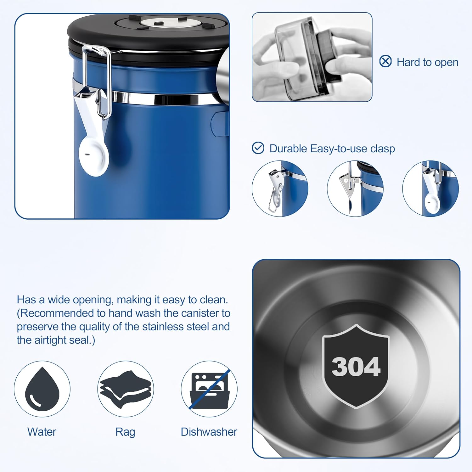 - 【STAINLESS STEEL COFFEE CONTAINER】Made from high-quality 304 stainless steel, the opaque body creates an ideal environment for storing coffee beans. The canister blocks out light and moisture to protect your ingredients—whether they’re coffee beans, dried nuts, or other pantry staples.Its robust construction offers long-lasting durability.