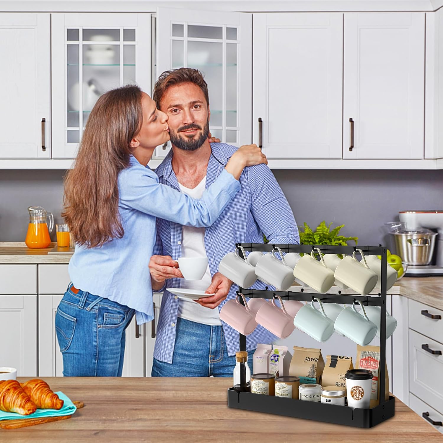 - 【Large Storage Coffee Mug Holder】 - 16 mug hooks and large capacity tray. RCHYFEED coffee cup organizer owns large capacity, 2 tier shelf with hooks holds up to 16 coffee mugs. The bottom storage tray can hold various coffee beans, syrup, coffee cups, sugar bag, tea packet, creamer, snacks and other various items. A great coffee bar accessory.