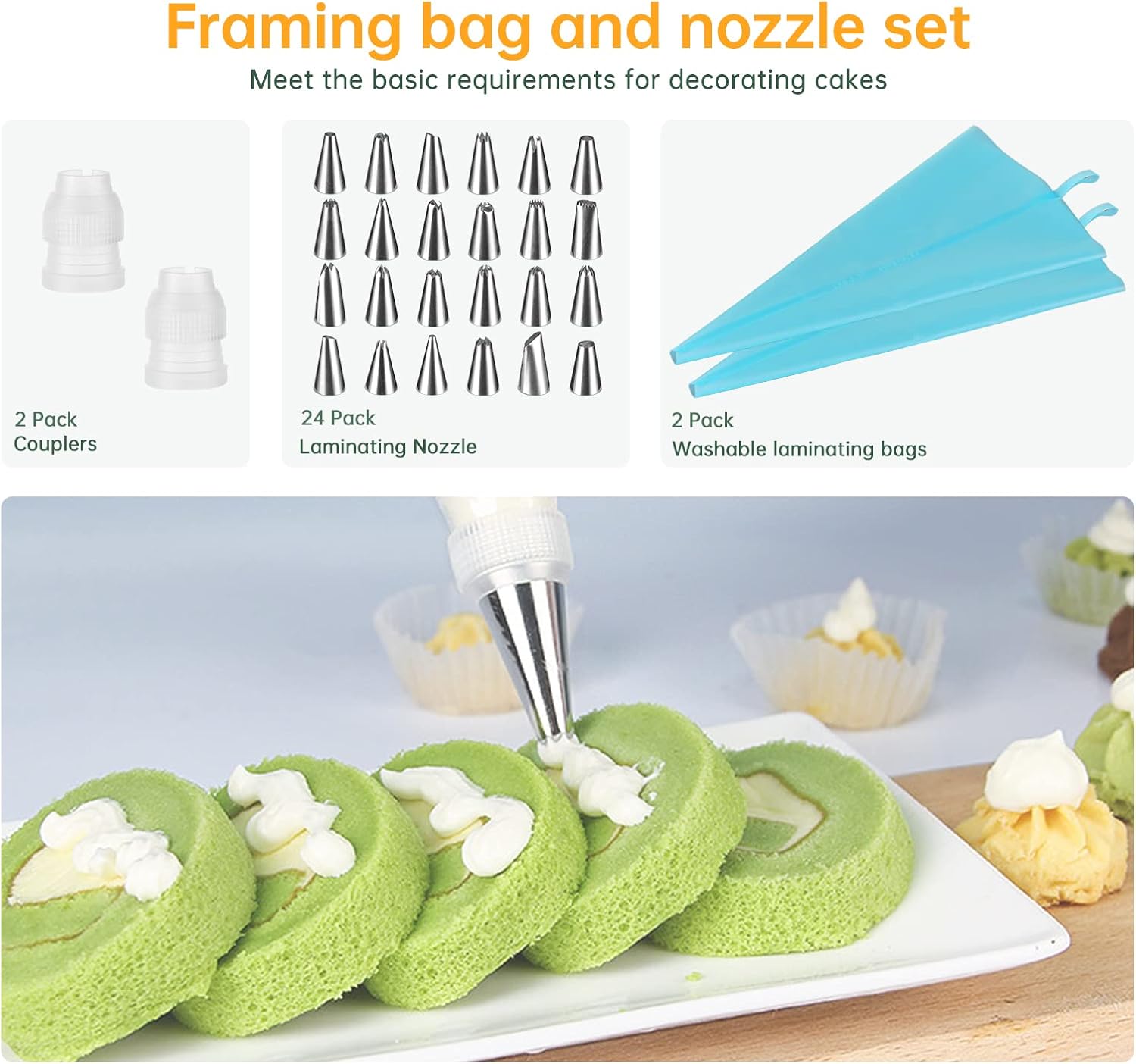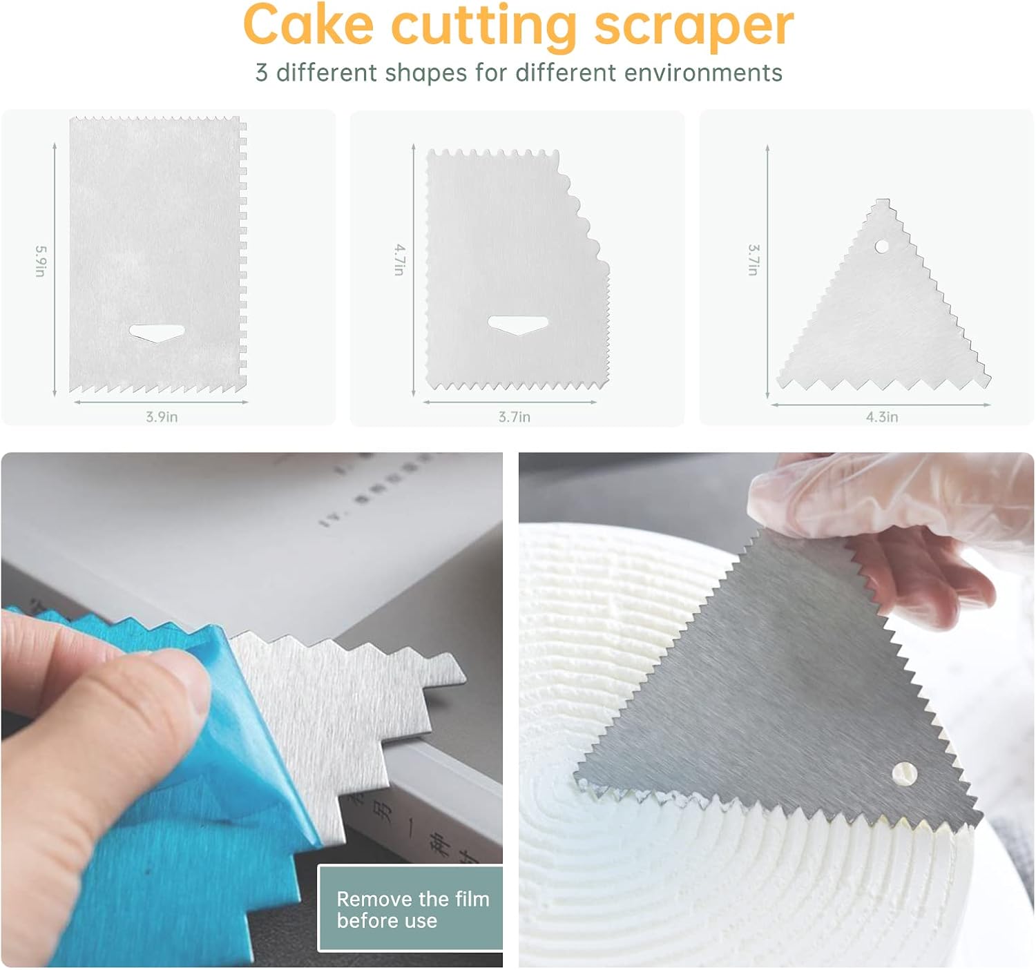- ❤1 X Aluminium alloy cake turntable,1 cake leveler,3 icing combs,24 stainless steel decorating tips,2 reusable plastic couplers,1 flower nails,2 silicone piping bags,2 cream spatulas