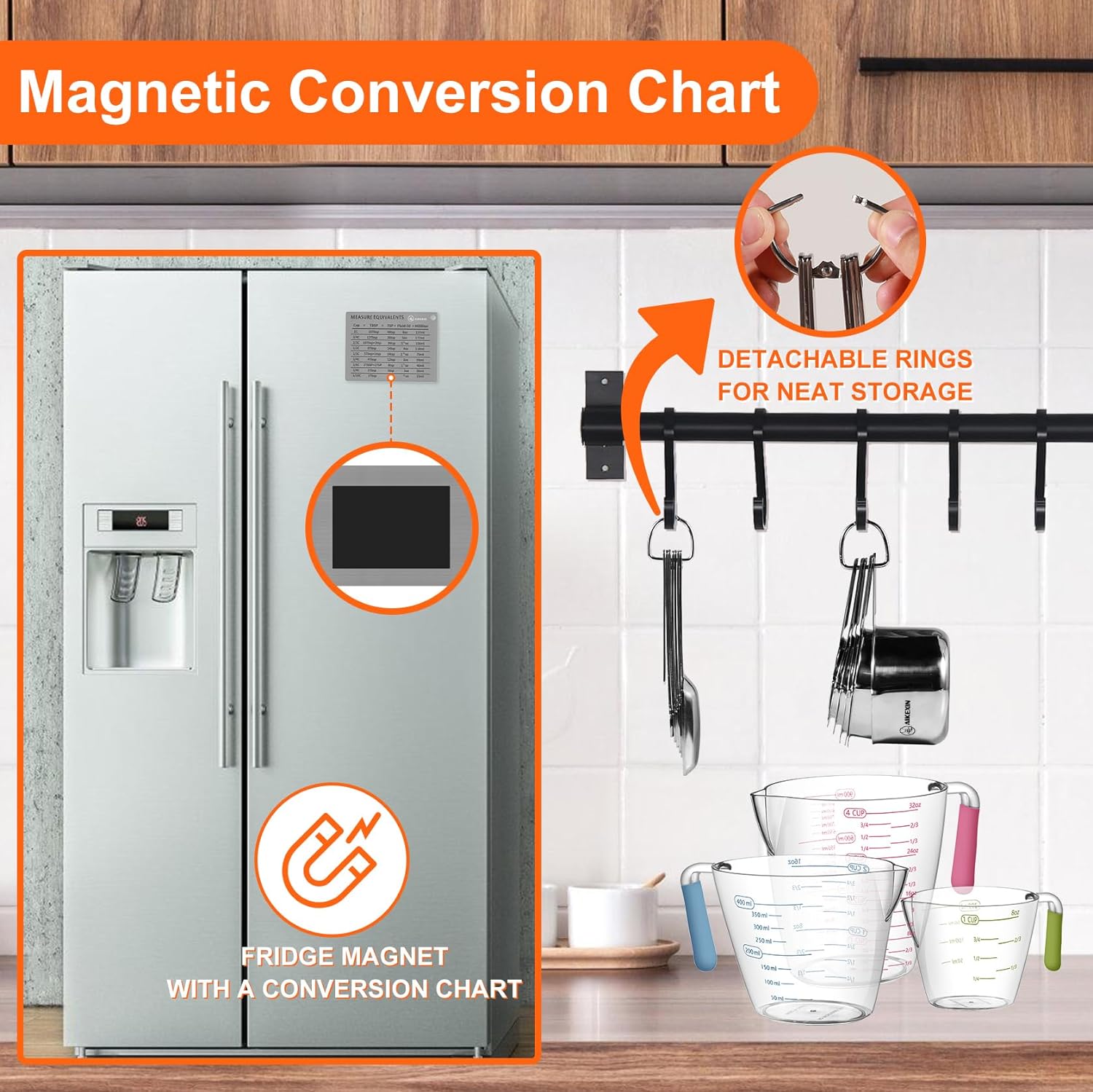 - [Easy to Clean and Store]: Stackable professional measuring cups and spoons set is easy to clean, which can be safely put into the dishwasher after use. Metal rings allow them to be stored in drawers or hung on hooks in the kitchen, which not only save space but also perfectly keep the kitchen clean. (but for the plastic cups, manual cleaning is recommended).