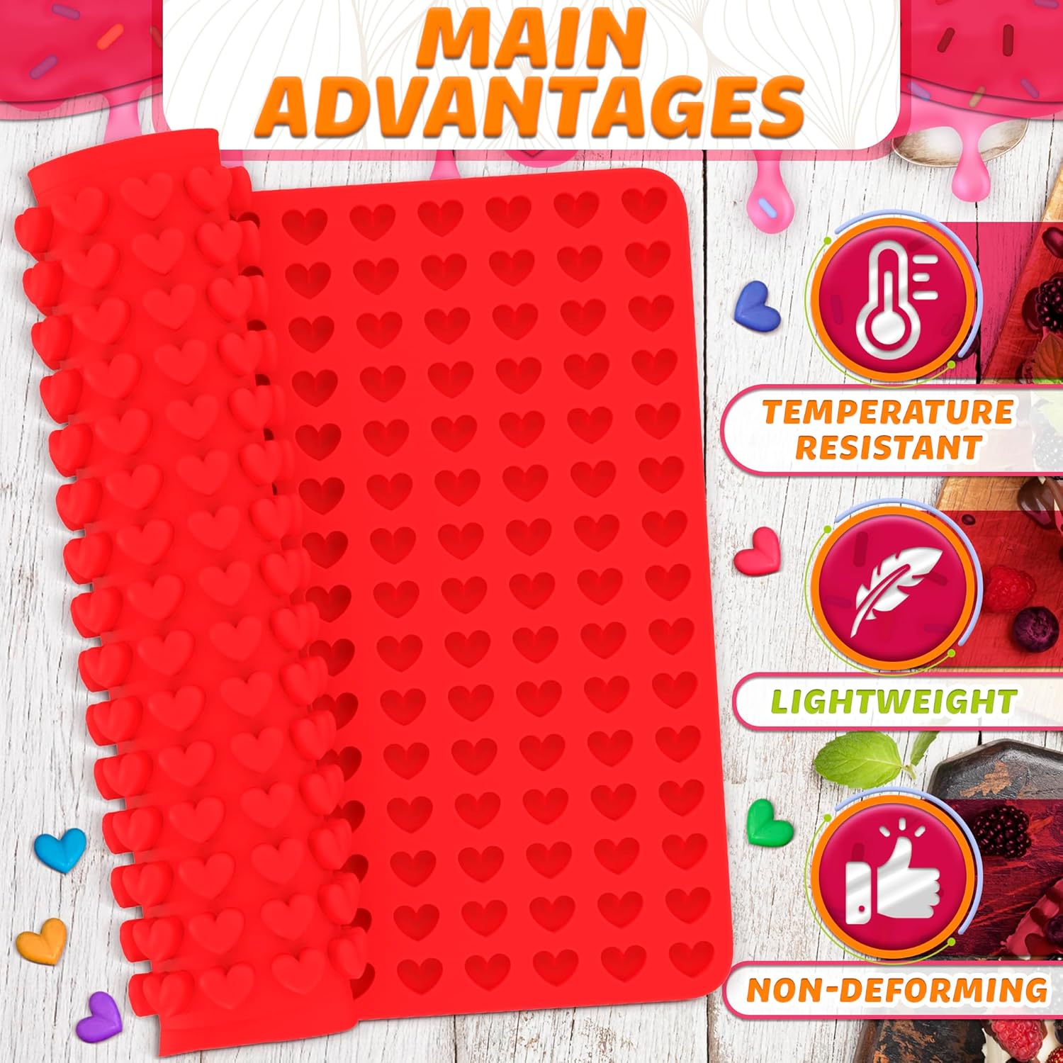 255 Cavities Mini Hearts Mold - 15.4" x 10.9" Mini Heart Silicone Mold for Making Candies, Chocolates and Gummies - Red Heart Ice Cube Tray with Easy Demolding, Flexible & Durable Heart Molds Silicone