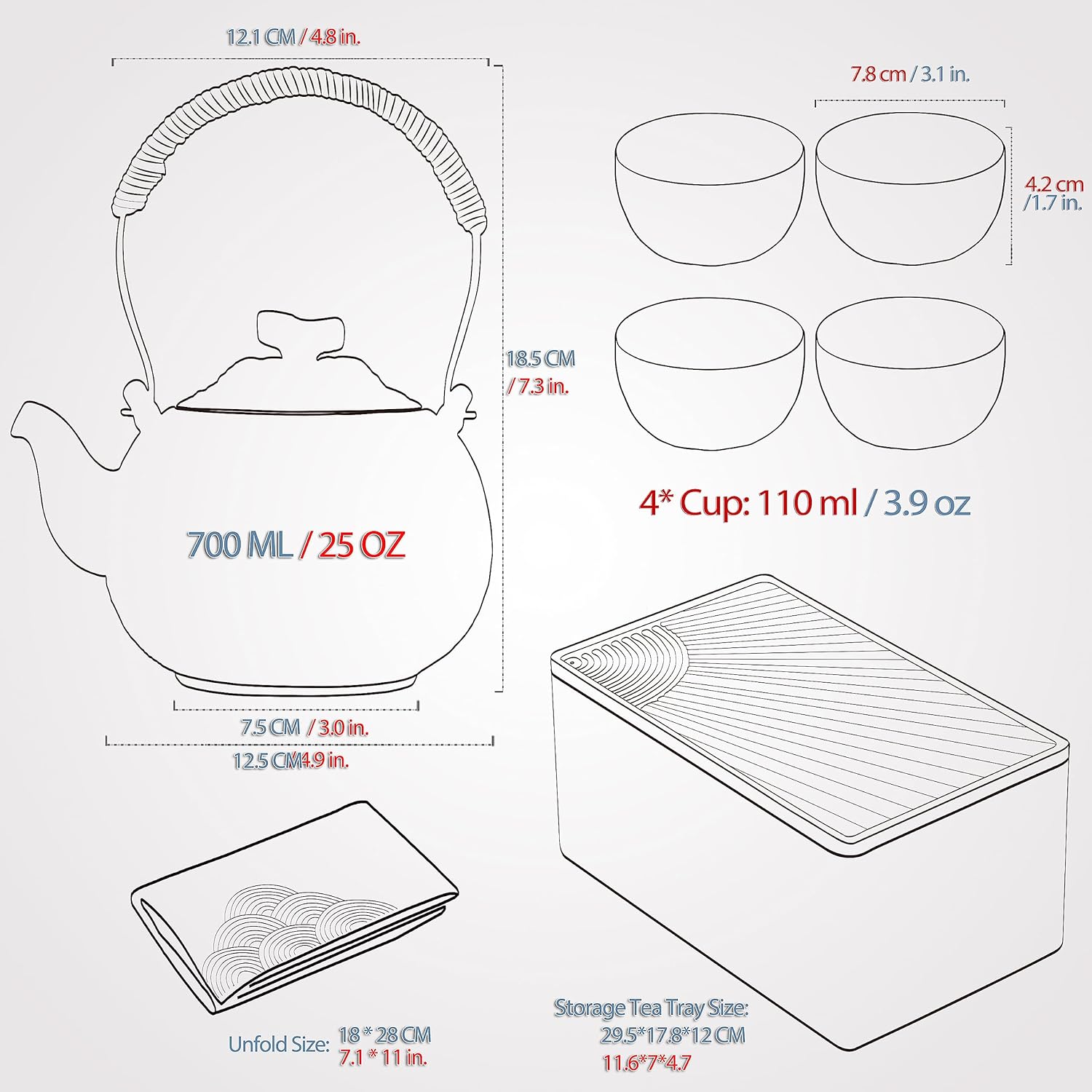 - COMPREHENSIVE SET CONFIGURATION:The Chinese gongfu tea set includes 1*700ml/25oz teapot, 6*205ml/7.2oz tea cups, a 304 stainless steel filter, a plastic multi-funcation tea tray, an embroidered Japanese-style wave tea towel, a Black Sandalwood Tea Pen, a Drainage pipe with water-absorbing ballWith this complete set, you have everything you need to enjoy a delightful tea experience.The adorable and rustic design of the entire tea set adds practical, artistic, and collectible value.