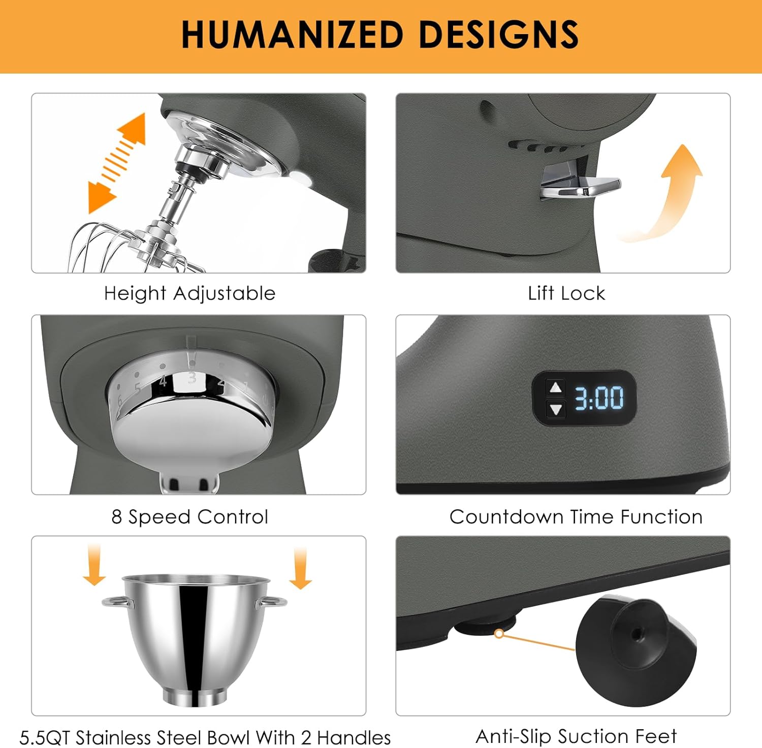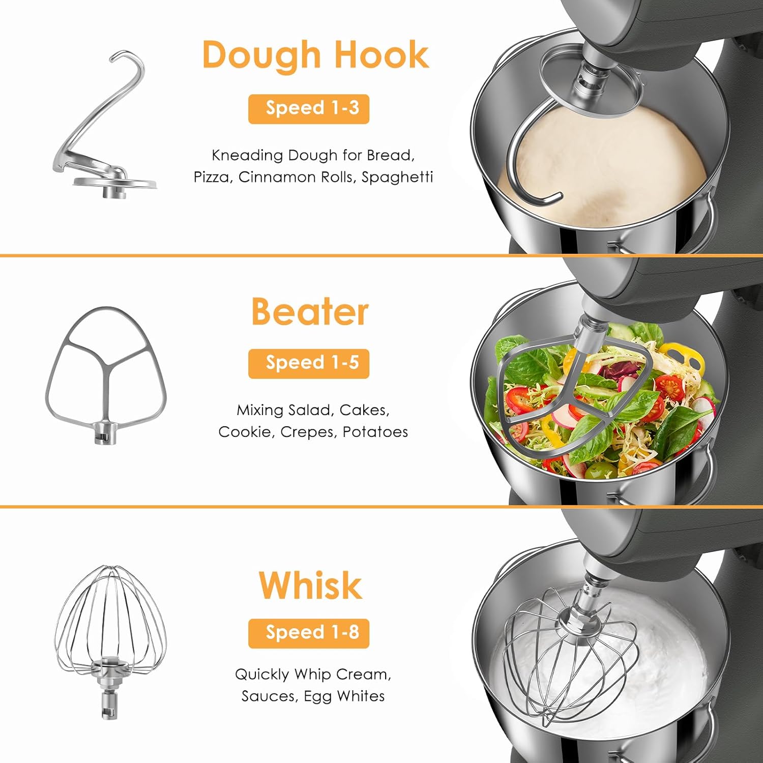 - 【Food Grade & Washable Accessories】Accessories include a 5.5QT Bowl, Dough Hook, Beater, and Whisk made of food-grade stainless steel, and a splash guard. Accessories are machine washable and can be in direct contact with your family. Four buckles on the bottom of the bowl make it more stable and firm. Anti-shock design, insulated base, emergency power off. With thoughtful consideration for your family!