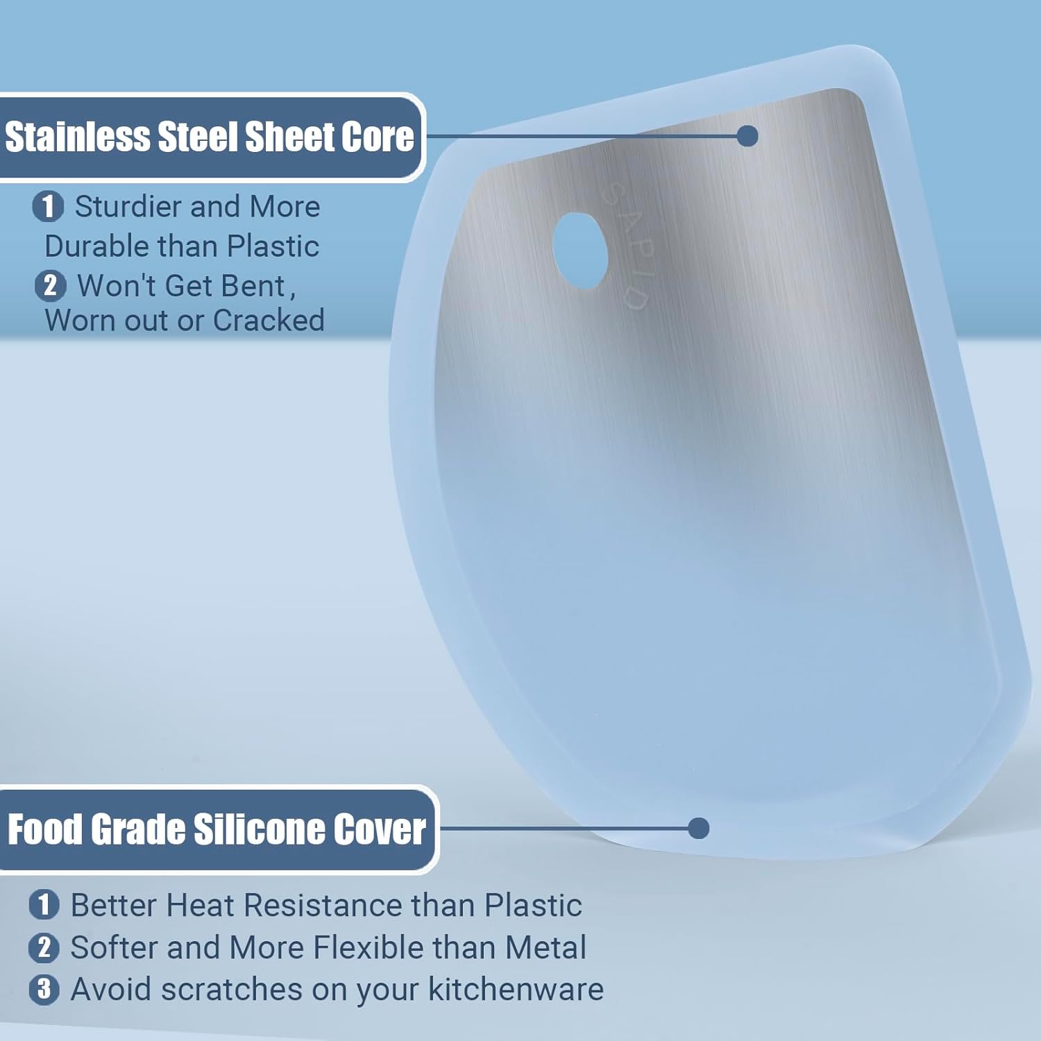- Silicone Cover and Stainless Steel Core : Inside the pastry scraper is sturdy stainless steel sheet, compared with other flimsy plastic scraper, our baking scraper won't get bent, worn out or cracked. It is more durable and has longer service life. The covering surface is made of food-grade silicone, which has great flexibility and heat resistance. Unlike metal dough cutter, which are too stiff and sharp, silicone scraper can avoid leaving scratches on your kitchenware or hurting your hands.