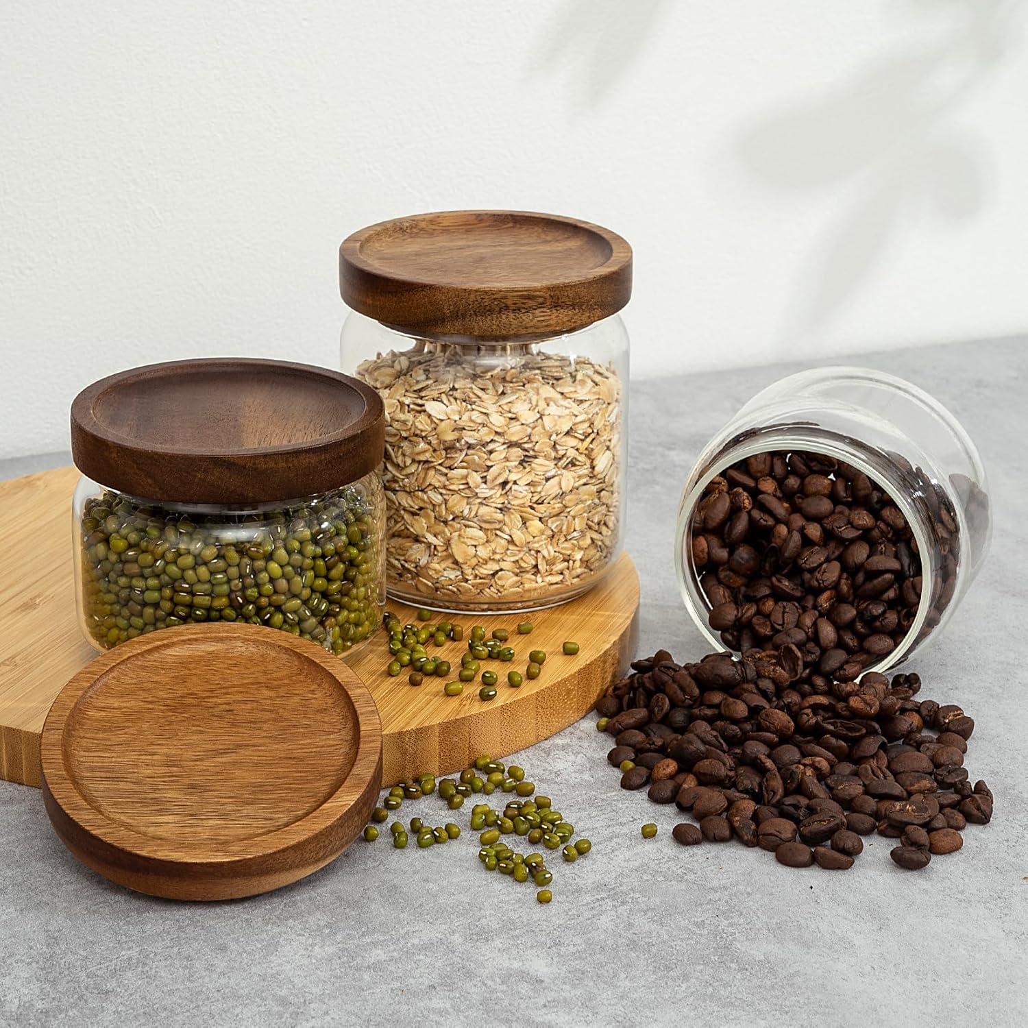 2PCS Small Glass Storage Jars with Airtight Lids, 11 fl oz (300ml) coffee container with Wooden Lid, Glass Pantry Canister for Beans, Rice, Sugar and etc