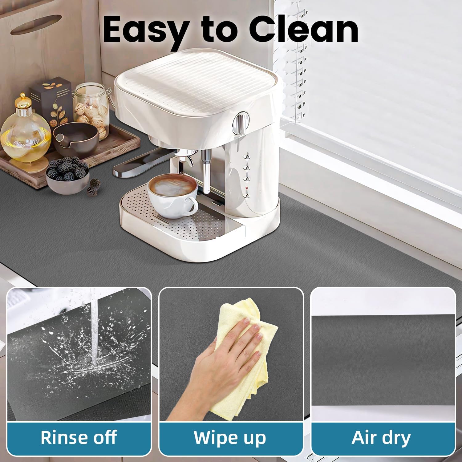 - Anti-Slip Rubber Backed: The bottom of this coffee machine mat is made of non-slip rubber, it will not move on the countertop. The rubber backing can protect your countertop from being damaged, it's the functional coffee accessories for coffee bar