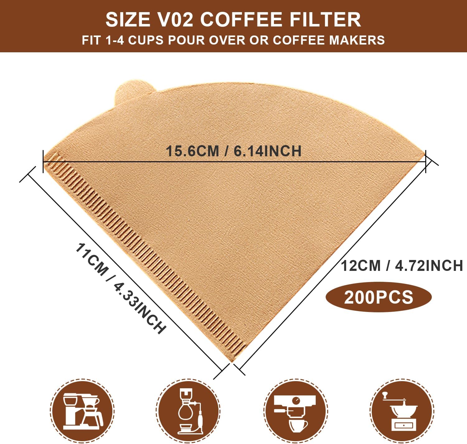 Gute 200Pcs Cone Coffee Filters, 2-4 Cups Unbleached Brown V02 Disposable Coffee Filter Paper, V-Shaped Pour Over Coffee Dripper and Drip Coffee Maker, Size 02