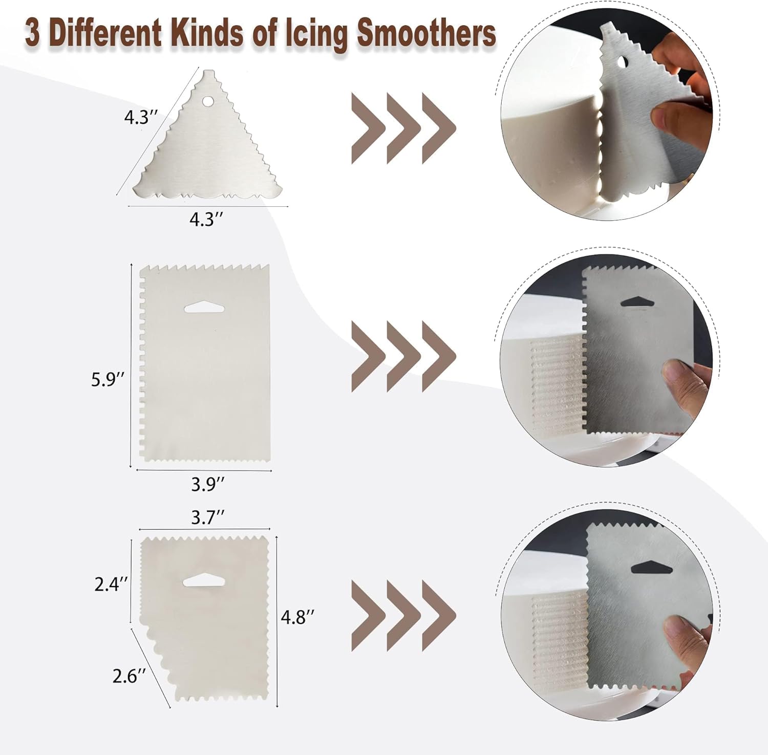 - Cake Decorating Supplies: 1 Acacia wood cake turntable, 2 icing spatulas and 3 comb Icing Smoothers would allow you to invent all types of patterns on cakes, or cupcakes( The comb has blue plastic film, please remove it before use)